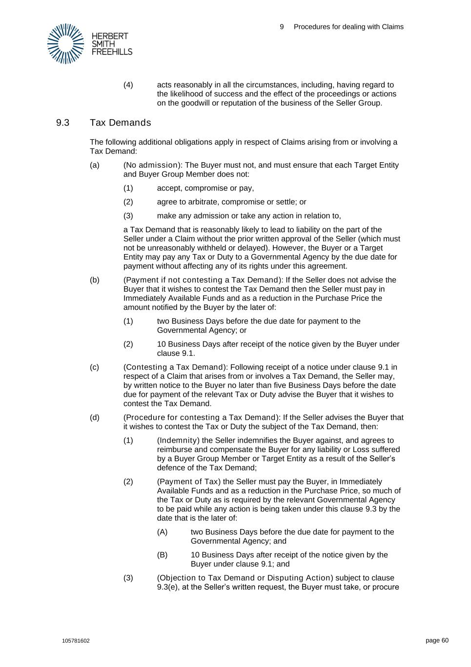 9 Procedures for dealing with Claims 105781602 page 60 (4) acts reasonably in all the circumstances, including, having regard to the likelihood of success and the effect of the proceedings or actions on the goodwill or reputation of the business of the Seller Group. 9.3 Tax Demands The following additional obligations apply in respect of Claims arising from or involving a Tax Demand: (a) (No admission): The Buyer must not, and must ensure that each Target Entity and Buyer Group Member does not: (1) accept, compromise or pay, (2) agree to arbitrate, compromise or settle; or (3) make any admission or take any action in relation to, a Tax Demand that is reasonably likely to lead to liability on the part of the Seller under a Claim without the prior written approval of the Seller (which must not be unreasonably withheld or delayed). However, the Buyer or a Target Entity may pay any Tax or Duty to a Governmental Agency by the due date for payment without affecting any of its rights under this agreement. (b) (Payment if not contesting a Tax Demand): If the Seller does not advise the Buyer that it wishes to contest the Tax Demand then the Seller must pay in Immediately Available Funds and as a reduction in the Purchase Price the amount notified by the Buyer by the later of: (1) two Business Days before the due date for payment to the Governmental Agency; or (2) 10 Business Days after receipt of the notice given by the Buyer under clause 9.1. (c) (Contesting a Tax Demand): Following receipt of a notice under clause 9.1 in respect of a Claim that arises from or involves a Tax Demand, the Seller may, by written notice to the Buyer no later than five Business Days before the date due for payment of the relevant Tax or Duty advise the Buyer that it wishes to contest the Tax Demand. (d) (Procedure for contesting a Tax Demand): If the Seller advises the Buyer that it wishes to contest the Tax or Duty the subject of the Tax Demand, then: (1) (Indemnity) the Seller indemnifies the Buyer against, and agrees to reimburse and compensate the Buyer for any liability or Loss suffered by a Buyer Group Member or Target Entity as a result of the Seller’s defence of the Tax Demand; (2) (Payment of Tax) the Seller must pay the Buyer, in Immediately Available Funds and as a reduction in the Purchase Price, so much of the Tax or Duty as is required by the relevant Governmental Agency to be paid while any action is being taken under this clause 9.3 by the date that is the later of: (A) two Business Days before the due date for payment to the Governmental Agency; and (B) 10 Business Days after receipt of the notice given by the Buyer under clause 9.1; and (3) (Objection to Tax Demand or Disputing Action) subject to clause 9.3(e), at the Seller’s written request, the Buyer must take, or procure