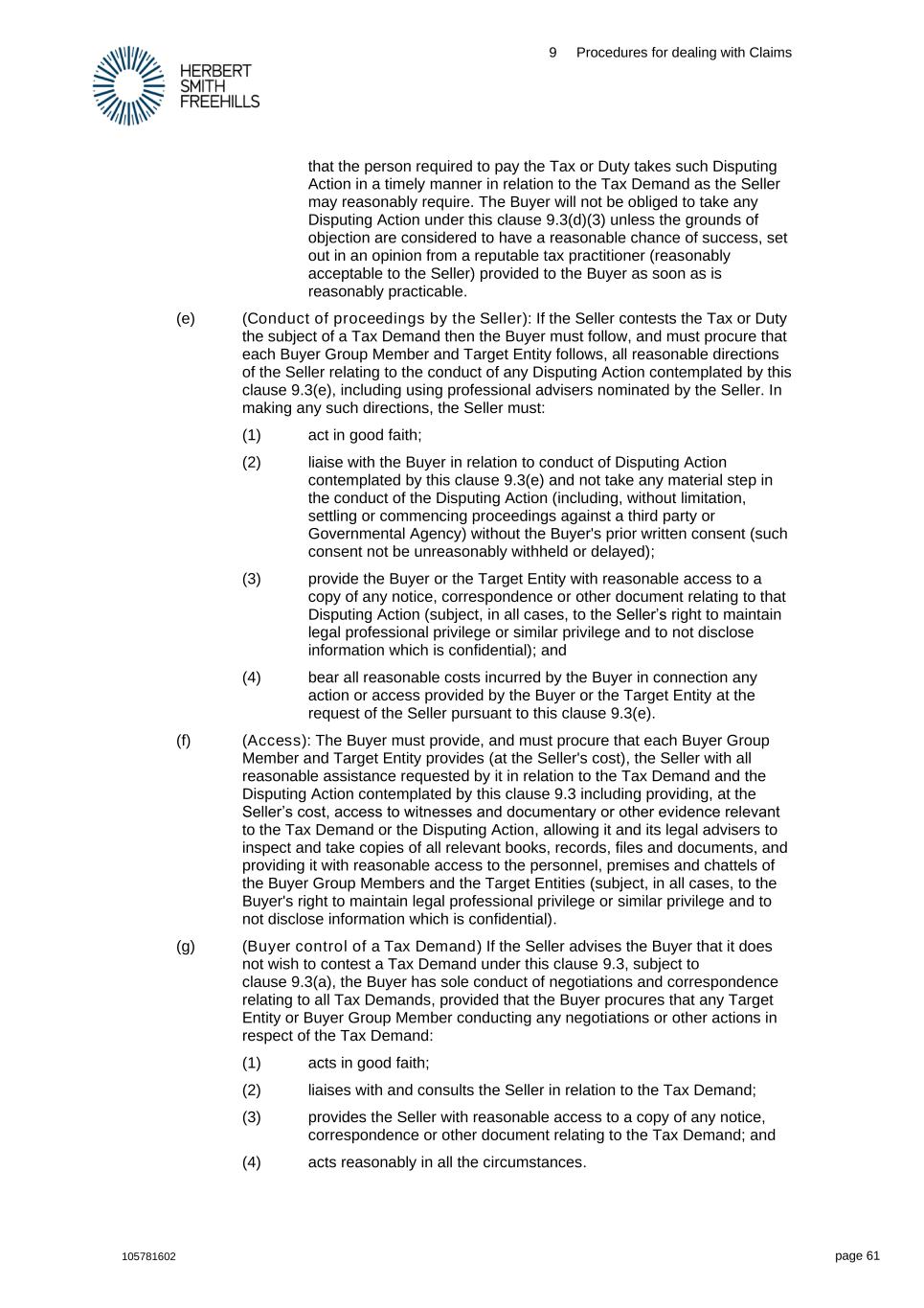 9 Procedures for dealing with Claims 105781602 page 61 that the person required to pay the Tax or Duty takes such Disputing Action in a timely manner in relation to the Tax Demand as the Seller may reasonably require. The Buyer will not be obliged to take any Disputing Action under this clause 9.3(d)(3) unless the grounds of objection are considered to have a reasonable chance of success, set out in an opinion from a reputable tax practitioner (reasonably acceptable to the Seller) provided to the Buyer as soon as is reasonably practicable. (e) (Conduct of proceedings by the Seller): If the Seller contests the Tax or Duty the subject of a Tax Demand then the Buyer must follow, and must procure that each Buyer Group Member and Target Entity follows, all reasonable directions of the Seller relating to the conduct of any Disputing Action contemplated by this clause 9.3(e), including using professional advisers nominated by the Seller. In making any such directions, the Seller must: (1) act in good faith; (2) liaise with the Buyer in relation to conduct of Disputing Action contemplated by this clause 9.3(e) and not take any material step in the conduct of the Disputing Action (including, without limitation, settling or commencing proceedings against a third party or Governmental Agency) without the Buyer's prior written consent (such consent not be unreasonably withheld or delayed); (3) provide the Buyer or the Target Entity with reasonable access to a copy of any notice, correspondence or other document relating to that Disputing Action (subject, in all cases, to the Seller’s right to maintain legal professional privilege or similar privilege and to not disclose information which is confidential); and (4) bear all reasonable costs incurred by the Buyer in connection any action or access provided by the Buyer or the Target Entity at the request of the Seller pursuant to this clause 9.3(e). (f) (Access): The Buyer must provide, and must procure that each Buyer Group Member and Target Entity provides (at the Seller's cost), the Seller with all reasonable assistance requested by it in relation to the Tax Demand and the Disputing Action contemplated by this clause 9.3 including providing, at the Seller’s cost, access to witnesses and documentary or other evidence relevant to the Tax Demand or the Disputing Action, allowing it and its legal advisers to inspect and take copies of all relevant books, records, files and documents, and providing it with reasonable access to the personnel, premises and chattels of the Buyer Group Members and the Target Entities (subject, in all cases, to the Buyer's right to maintain legal professional privilege or similar privilege and to not disclose information which is confidential). (g) (Buyer control of a Tax Demand) If the Seller advises the Buyer that it does not wish to contest a Tax Demand under this clause 9.3, subject to clause 9.3(a), the Buyer has sole conduct of negotiations and correspondence relating to all Tax Demands, provided that the Buyer procures that any Target Entity or Buyer Group Member conducting any negotiations or other actions in respect of the Tax Demand: (1) acts in good faith; (2) liaises with and consults the Seller in relation to the Tax Demand; (3) provides the Seller with reasonable access to a copy of any notice, correspondence or other document relating to the Tax Demand; and (4) acts reasonably in all the circumstances.
