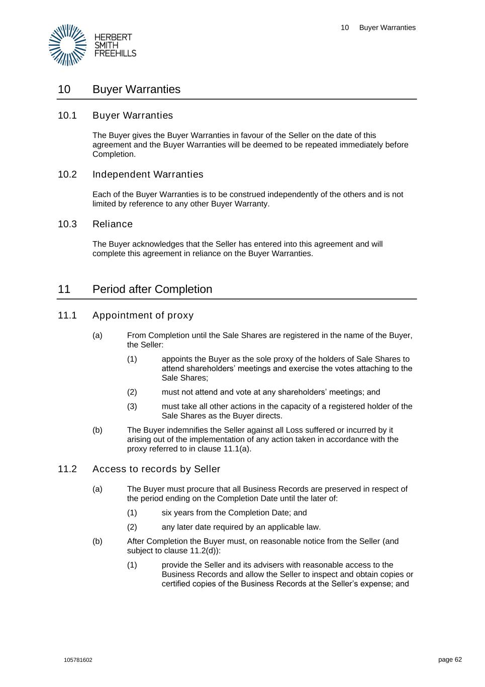 10 Buyer Warranties 105781602 page 62 10 Buyer Warranties 10.1 Buyer Warranties The Buyer gives the Buyer Warranties in favour of the Seller on the date of this agreement and the Buyer Warranties will be deemed to be repeated immediately before Completion. 10.2 Independent Warranties Each of the Buyer Warranties is to be construed independently of the others and is not limited by reference to any other Buyer Warranty. 10.3 Reliance The Buyer acknowledges that the Seller has entered into this agreement and will complete this agreement in reliance on the Buyer Warranties. 11 Period after Completion 11.1 Appointment of proxy (a) From Completion until the Sale Shares are registered in the name of the Buyer, the Seller: (1) appoints the Buyer as the sole proxy of the holders of Sale Shares to attend shareholders’ meetings and exercise the votes attaching to the Sale Shares; (2) must not attend and vote at any shareholders’ meetings; and (3) must take all other actions in the capacity of a registered holder of the Sale Shares as the Buyer directs. (b) The Buyer indemnifies the Seller against all Loss suffered or incurred by it arising out of the implementation of any action taken in accordance with the proxy referred to in clause 11.1(a). 11.2 Access to records by Seller (a) The Buyer must procure that all Business Records are preserved in respect of the period ending on the Completion Date until the later of: (1) six years from the Completion Date; and (2) any later date required by an applicable law. (b) After Completion the Buyer must, on reasonable notice from the Seller (and subject to clause 11.2(d)): (1) provide the Seller and its advisers with reasonable access to the Business Records and allow the Seller to inspect and obtain copies or certified copies of the Business Records at the Seller’s expense; and