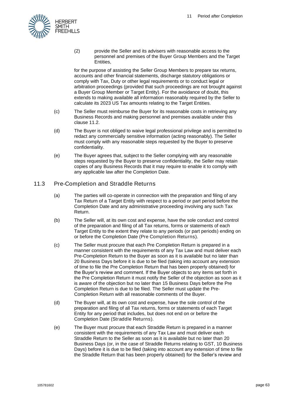 11 Period after Completion 105781602 page 63 (2) provide the Seller and its advisers with reasonable access to the personnel and premises of the Buyer Group Members and the Target Entities, for the purpose of assisting the Seller Group Members to prepare tax returns, accounts and other financial statements, discharge statutory obligations or comply with Tax, Duty or other legal requirements or to conduct legal or arbitration proceedings (provided that such proceedings are not brought against a Buyer Group Member or Target Entity). For the avoidance of doubt, this extends to making available all information reasonably required by the Seller to calculate its 2023 US Tax amounts relating to the Target Entities. (c) The Seller must reimburse the Buyer for its reasonable costs in retrieving any Business Records and making personnel and premises available under this clause 11.2. (d) The Buyer is not obliged to waive legal professional privilege and is permitted to redact any commercially sensitive information (acting reasonably). The Seller must comply with any reasonable steps requested by the Buyer to preserve confidentiality. (e) The Buyer agrees that, subject to the Seller complying with any reasonable steps requested by the Buyer to preserve confidentiality, the Seller may retain copies of any Business Records that it may require to enable it to comply with any applicable law after the Completion Date. 11.3 Pre-Completion and Straddle Returns (a) The parties will co-operate in connection with the preparation and filing of any Tax Return of a Target Entity with respect to a period or part period before the Completion Date and any administrative proceeding involving any such Tax Return. (b) The Seller will, at its own cost and expense, have the sole conduct and control of the preparation and filing of all Tax returns, forms or statements of each Target Entity to the extent they relate to any periods (or part periods) ending on or before the Completion Date (Pre Completion Returns). (c) The Seller must procure that each Pre Completion Return is prepared in a manner consistent with the requirements of any Tax Law and must deliver each Pre-Completion Return to the Buyer as soon as it is available but no later than 20 Business Days before it is due to be filed (taking into account any extension of time to file the Pre Completion Return that has been properly obtained) for the Buyer’s review and comment. If the Buyer objects to any items set forth in the Pre Completion Return it must notify the Seller of the objection as soon as it is aware of the objection but no later than 15 Business Days before the Pre Completion Return is due to be filed. The Seller must update the Pre- Completion Return with all reasonable comments of the Buyer. (d) The Buyer will, at its own cost and expense, have the sole control of the preparation and filing of all Tax returns, forms or statements of each Target Entity for any period that includes, but does not end on or before the Completion Date (Straddle Returns). (e) The Buyer must procure that each Straddle Return is prepared in a manner consistent with the requirements of any Tax Law and must deliver each Straddle Return to the Seller as soon as it is available but no later than 20 Business Days (or, in the case of Straddle Returns relating to GST, 10 Business Days) before it is due to be filed (taking into account any extension of time to file the Straddle Return that has been properly obtained) for the Seller’s review and