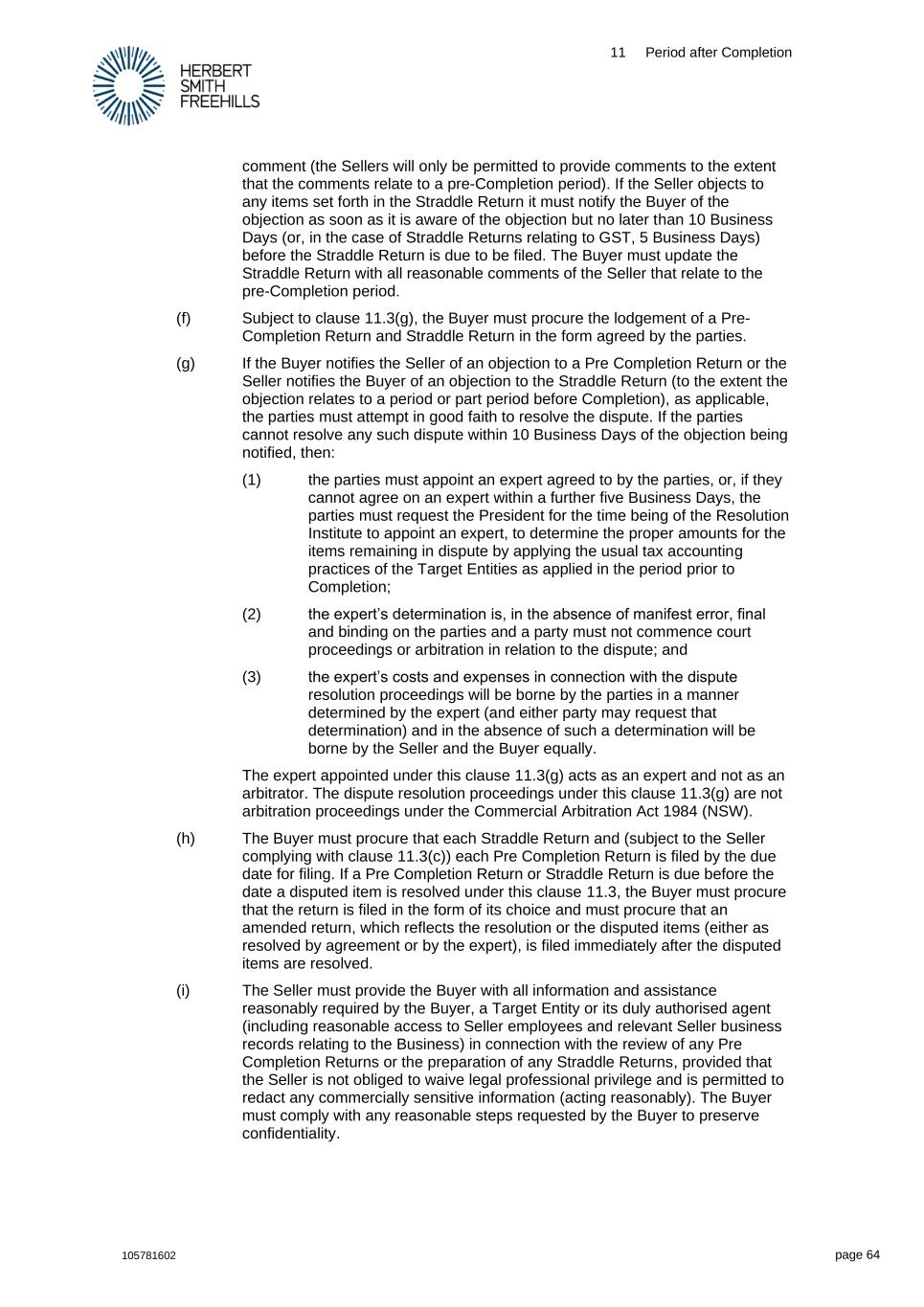 11 Period after Completion 105781602 page 64 comment (the Sellers will only be permitted to provide comments to the extent that the comments relate to a pre-Completion period). If the Seller objects to any items set forth in the Straddle Return it must notify the Buyer of the objection as soon as it is aware of the objection but no later than 10 Business Days (or, in the case of Straddle Returns relating to GST, 5 Business Days) before the Straddle Return is due to be filed. The Buyer must update the Straddle Return with all reasonable comments of the Seller that relate to the pre-Completion period. (f) Subject to clause 11.3(g), the Buyer must procure the lodgement of a Pre- Completion Return and Straddle Return in the form agreed by the parties. (g) If the Buyer notifies the Seller of an objection to a Pre Completion Return or the Seller notifies the Buyer of an objection to the Straddle Return (to the extent the objection relates to a period or part period before Completion), as applicable, the parties must attempt in good faith to resolve the dispute. If the parties cannot resolve any such dispute within 10 Business Days of the objection being notified, then: (1) the parties must appoint an expert agreed to by the parties, or, if they cannot agree on an expert within a further five Business Days, the parties must request the President for the time being of the Resolution Institute to appoint an expert, to determine the proper amounts for the items remaining in dispute by applying the usual tax accounting practices of the Target Entities as applied in the period prior to Completion; (2) the expert’s determination is, in the absence of manifest error, final and binding on the parties and a party must not commence court proceedings or arbitration in relation to the dispute; and (3) the expert’s costs and expenses in connection with the dispute resolution proceedings will be borne by the parties in a manner determined by the expert (and either party may request that determination) and in the absence of such a determination will be borne by the Seller and the Buyer equally. The expert appointed under this clause 11.3(g) acts as an expert and not as an arbitrator. The dispute resolution proceedings under this clause 11.3(g) are not arbitration proceedings under the Commercial Arbitration Act 1984 (NSW). (h) The Buyer must procure that each Straddle Return and (subject to the Seller complying with clause 11.3(c)) each Pre Completion Return is filed by the due date for filing. If a Pre Completion Return or Straddle Return is due before the date a disputed item is resolved under this clause 11.3, the Buyer must procure that the return is filed in the form of its choice and must procure that an amended return, which reflects the resolution or the disputed items (either as resolved by agreement or by the expert), is filed immediately after the disputed items are resolved. (i) The Seller must provide the Buyer with all information and assistance reasonably required by the Buyer, a Target Entity or its duly authorised agent (including reasonable access to Seller employees and relevant Seller business records relating to the Business) in connection with the review of any Pre Completion Returns or the preparation of any Straddle Returns, provided that the Seller is not obliged to waive legal professional privilege and is permitted to redact any commercially sensitive information (acting reasonably). The Buyer must comply with any reasonable steps requested by the Buyer to preserve confidentiality.