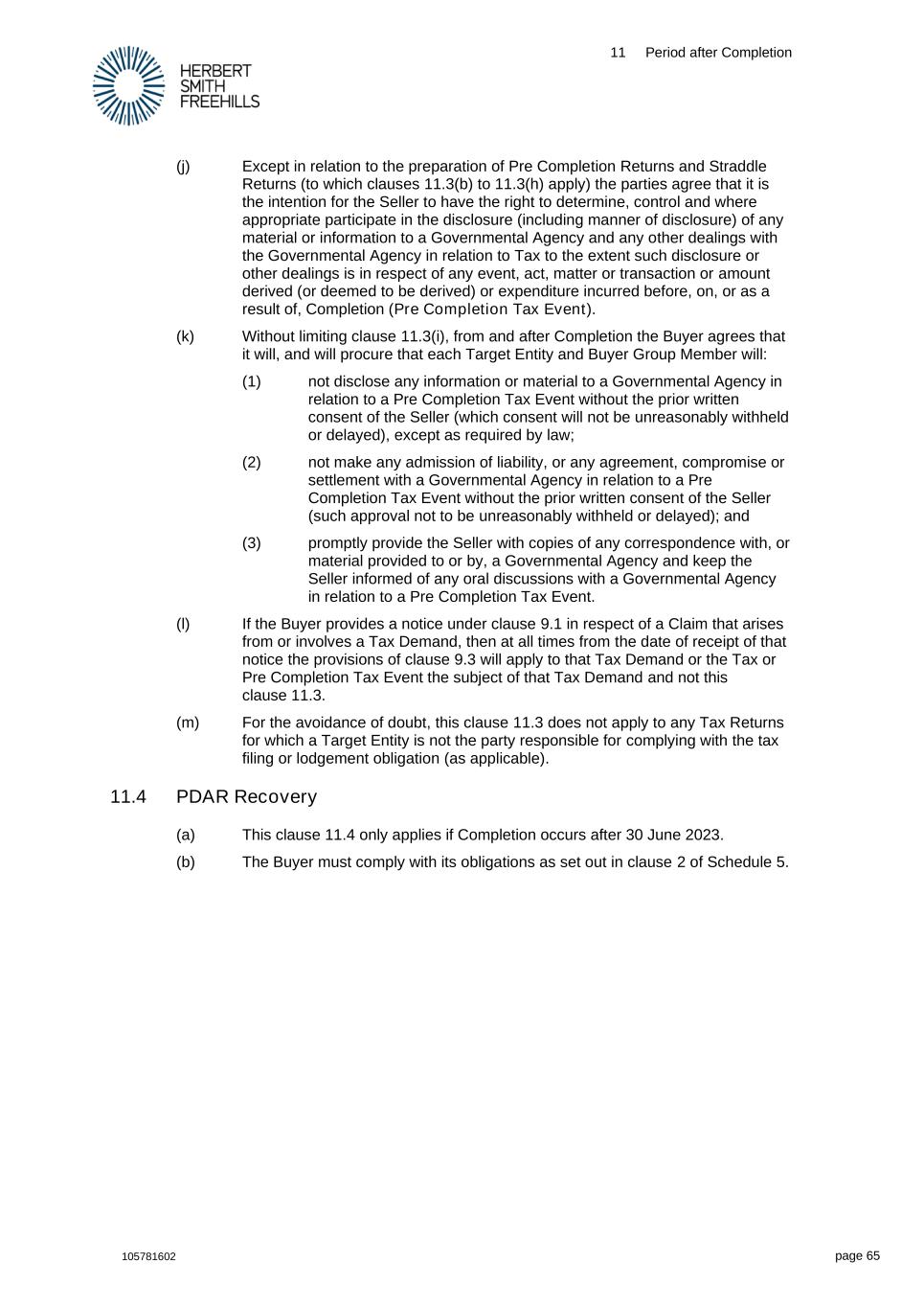 11 Period after Completion 105781602 page 65 (j) Except in relation to the preparation of Pre Completion Returns and Straddle Returns (to which clauses 11.3(b) to 11.3(h) apply) the parties agree that it is the intention for the Seller to have the right to determine, control and where appropriate participate in the disclosure (including manner of disclosure) of any material or information to a Governmental Agency and any other dealings with the Governmental Agency in relation to Tax to the extent such disclosure or other dealings is in respect of any event, act, matter or transaction or amount derived (or deemed to be derived) or expenditure incurred before, on, or as a result of, Completion (Pre Completion Tax Event). (k) Without limiting clause 11.3(i), from and after Completion the Buyer agrees that it will, and will procure that each Target Entity and Buyer Group Member will: (1) not disclose any information or material to a Governmental Agency in relation to a Pre Completion Tax Event without the prior written consent of the Seller (which consent will not be unreasonably withheld or delayed), except as required by law; (2) not make any admission of liability, or any agreement, compromise or settlement with a Governmental Agency in relation to a Pre Completion Tax Event without the prior written consent of the Seller (such approval not to be unreasonably withheld or delayed); and (3) promptly provide the Seller with copies of any correspondence with, or material provided to or by, a Governmental Agency and keep the Seller informed of any oral discussions with a Governmental Agency in relation to a Pre Completion Tax Event. (l) If the Buyer provides a notice under clause 9.1 in respect of a Claim that arises from or involves a Tax Demand, then at all times from the date of receipt of that notice the provisions of clause 9.3 will apply to that Tax Demand or the Tax or Pre Completion Tax Event the subject of that Tax Demand and not this clause 11.3. (m) For the avoidance of doubt, this clause 11.3 does not apply to any Tax Returns for which a Target Entity is not the party responsible for complying with the tax filing or lodgement obligation (as applicable). 11.4 PDAR Recovery (a) This clause 11.4 only applies if Completion occurs after 30 June 2023. (b) The Buyer must comply with its obligations as set out in clause 2 of Schedule 5.