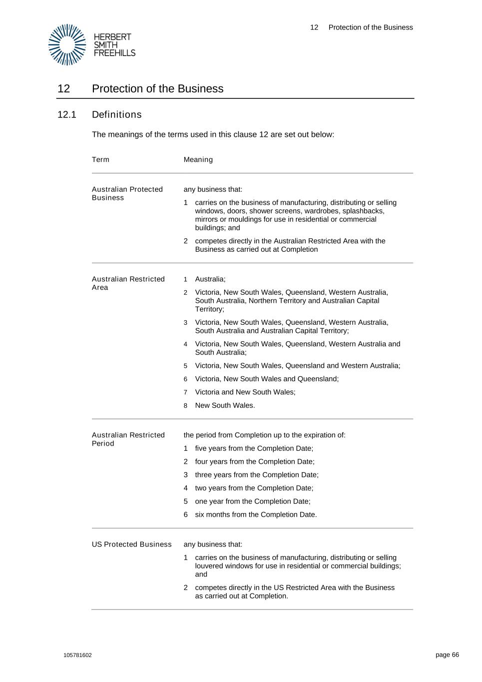 12 Protection of the Business 105781602 page 66 12 Protection of the Business 12.1 Definitions The meanings of the terms used in this clause 12 are set out below: Term Meaning Australian Protected Business any business that: 1 carries on the business of manufacturing, distributing or selling windows, doors, shower screens, wardrobes, splashbacks, mirrors or mouldings for use in residential or commercial buildings; and 2 competes directly in the Australian Restricted Area with the Business as carried out at Completion Australian Restricted Area 1 Australia; 2 Victoria, New South Wales, Queensland, Western Australia, South Australia, Northern Territory and Australian Capital Territory; 3 Victoria, New South Wales, Queensland, Western Australia, South Australia and Australian Capital Territory; 4 Victoria, New South Wales, Queensland, Western Australia and South Australia; 5 Victoria, New South Wales, Queensland and Western Australia; 6 Victoria, New South Wales and Queensland; 7 Victoria and New South Wales; 8 New South Wales. Australian Restricted Period the period from Completion up to the expiration of: 1 five years from the Completion Date; 2 four years from the Completion Date; 3 three years from the Completion Date; 4 two years from the Completion Date; 5 one year from the Completion Date; 6 six months from the Completion Date. US Protected Business any business that: 1 carries on the business of manufacturing, distributing or selling louvered windows for use in residential or commercial buildings; and 2 competes directly in the US Restricted Area with the Business as carried out at Completion.