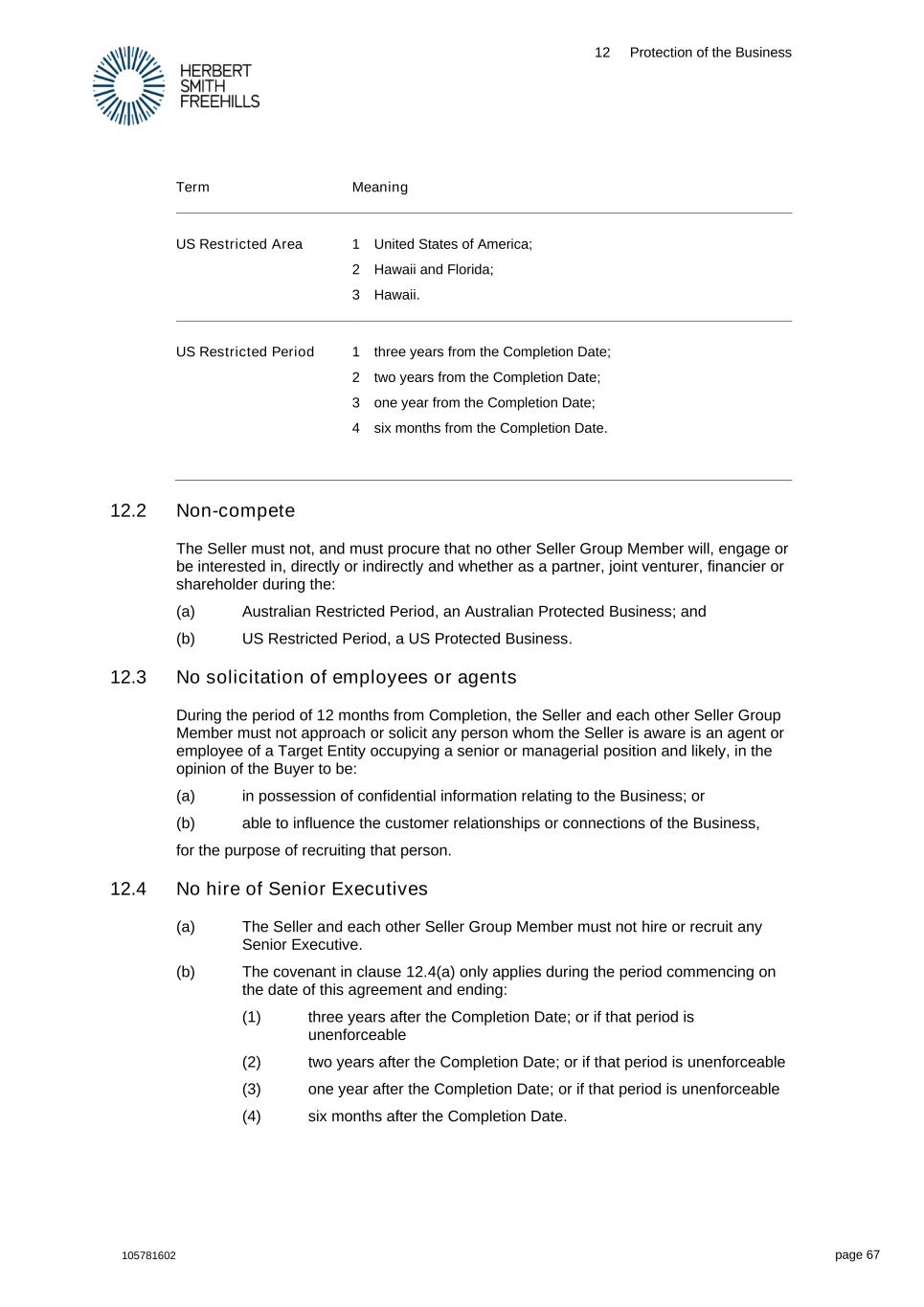12 Protection of the Business 105781602 page 67 Term Meaning US Restricted Area 1 United States of America; 2 Hawaii and Florida; 3 Hawaii. US Restricted Period 1 three years from the Completion Date; 2 two years from the Completion Date; 3 one year from the Completion Date; 4 six months from the Completion Date. 12.2 Non-compete The Seller must not, and must procure that no other Seller Group Member will, engage or be interested in, directly or indirectly and whether as a partner, joint venturer, financier or shareholder during the: (a) Australian Restricted Period, an Australian Protected Business; and (b) US Restricted Period, a US Protected Business. 12.3 No solicitation of employees or agents During the period of 12 months from Completion, the Seller and each other Seller Group Member must not approach or solicit any person whom the Seller is aware is an agent or employee of a Target Entity occupying a senior or managerial position and likely, in the opinion of the Buyer to be: (a) in possession of confidential information relating to the Business; or (b) able to influence the customer relationships or connections of the Business, for the purpose of recruiting that person. 12.4 No hire of Senior Executives (a) The Seller and each other Seller Group Member must not hire or recruit any Senior Executive. (b) The covenant in clause 12.4(a) only applies during the period commencing on the date of this agreement and ending: (1) three years after the Completion Date; or if that period is unenforceable (2) two years after the Completion Date; or if that period is unenforceable (3) one year after the Completion Date; or if that period is unenforceable (4) six months after the Completion Date.