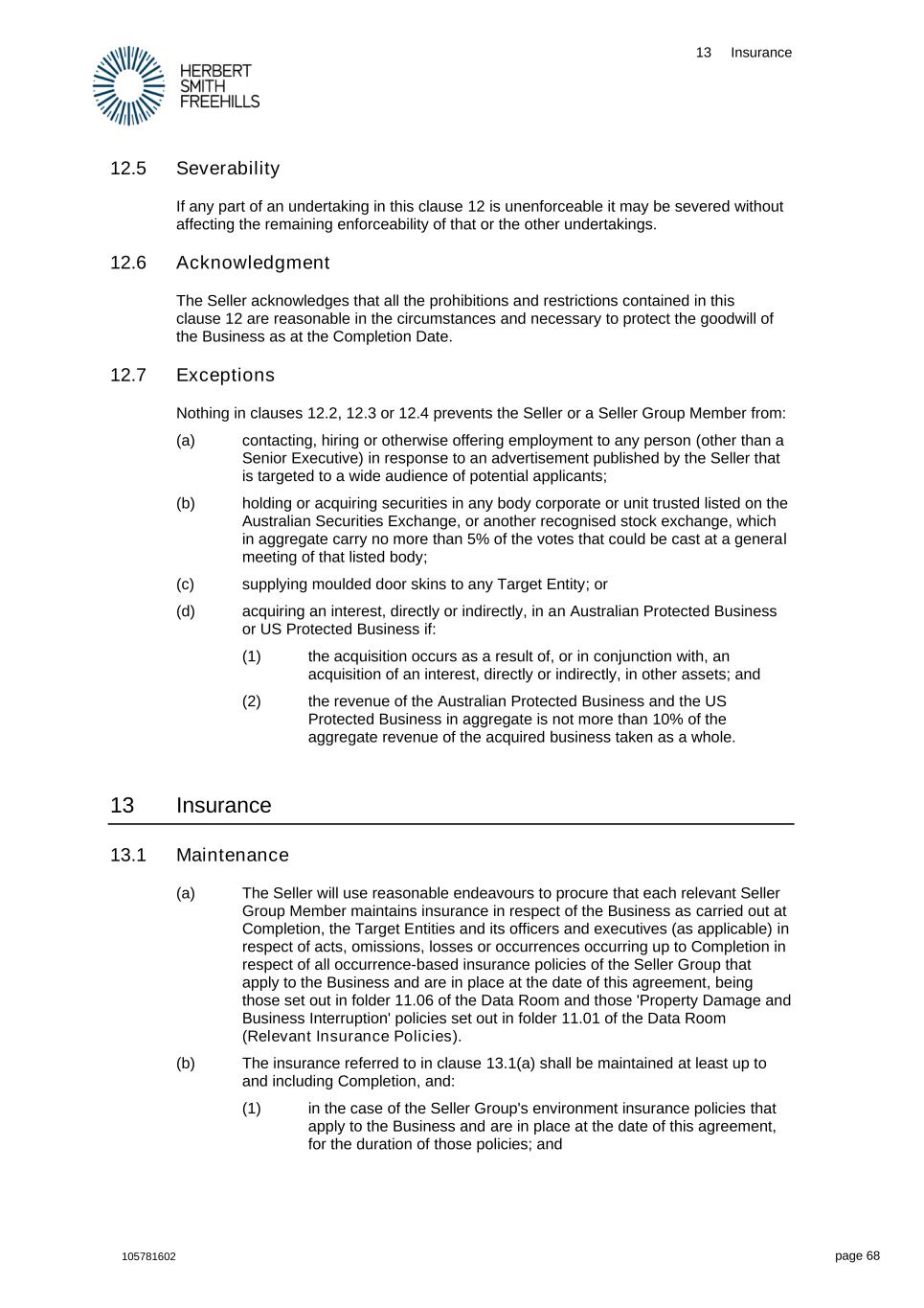13 Insurance 105781602 page 68 12.5 Severability If any part of an undertaking in this clause 12 is unenforceable it may be severed without affecting the remaining enforceability of that or the other undertakings. 12.6 Acknowledgment The Seller acknowledges that all the prohibitions and restrictions contained in this clause 12 are reasonable in the circumstances and necessary to protect the goodwill of the Business as at the Completion Date. 12.7 Exceptions Nothing in clauses 12.2, 12.3 or 12.4 prevents the Seller or a Seller Group Member from: (a) contacting, hiring or otherwise offering employment to any person (other than a Senior Executive) in response to an advertisement published by the Seller that is targeted to a wide audience of potential applicants; (b) holding or acquiring securities in any body corporate or unit trusted listed on the Australian Securities Exchange, or another recognised stock exchange, which in aggregate carry no more than 5% of the votes that could be cast at a general meeting of that listed body; (c) supplying moulded door skins to any Target Entity; or (d) acquiring an interest, directly or indirectly, in an Australian Protected Business or US Protected Business if: (1) the acquisition occurs as a result of, or in conjunction with, an acquisition of an interest, directly or indirectly, in other assets; and (2) the revenue of the Australian Protected Business and the US Protected Business in aggregate is not more than 10% of the aggregate revenue of the acquired business taken as a whole. 13 Insurance 13.1 Maintenance (a) The Seller will use reasonable endeavours to procure that each relevant Seller Group Member maintains insurance in respect of the Business as carried out at Completion, the Target Entities and its officers and executives (as applicable) in respect of acts, omissions, losses or occurrences occurring up to Completion in respect of all occurrence-based insurance policies of the Seller Group that apply to the Business and are in place at the date of this agreement, being those set out in folder 11.06 of the Data Room and those 'Property Damage and Business Interruption' policies set out in folder 11.01 of the Data Room (Relevant Insurance Policies). (b) The insurance referred to in clause 13.1(a) shall be maintained at least up to and including Completion, and: (1) in the case of the Seller Group's environment insurance policies that apply to the Business and are in place at the date of this agreement, for the duration of those policies; and