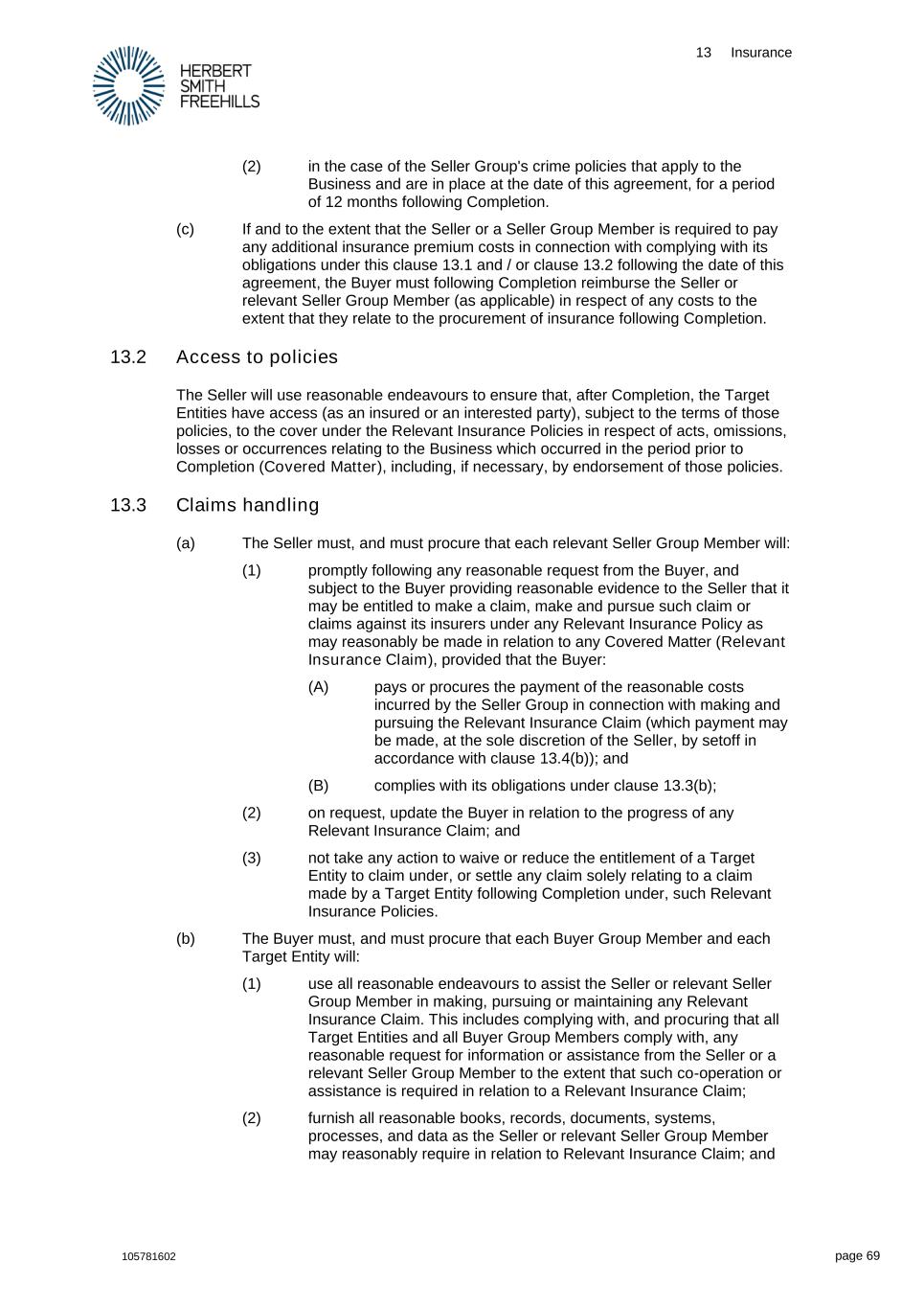 13 Insurance 105781602 page 69 (2) in the case of the Seller Group's crime policies that apply to the Business and are in place at the date of this agreement, for a period of 12 months following Completion. (c) If and to the extent that the Seller or a Seller Group Member is required to pay any additional insurance premium costs in connection with complying with its obligations under this clause 13.1 and / or clause 13.2 following the date of this agreement, the Buyer must following Completion reimburse the Seller or relevant Seller Group Member (as applicable) in respect of any costs to the extent that they relate to the procurement of insurance following Completion. 13.2 Access to policies The Seller will use reasonable endeavours to ensure that, after Completion, the Target Entities have access (as an insured or an interested party), subject to the terms of those policies, to the cover under the Relevant Insurance Policies in respect of acts, omissions, losses or occurrences relating to the Business which occurred in the period prior to Completion (Covered Matter), including, if necessary, by endorsement of those policies. 13.3 Claims handling (a) The Seller must, and must procure that each relevant Seller Group Member will: (1) promptly following any reasonable request from the Buyer, and subject to the Buyer providing reasonable evidence to the Seller that it may be entitled to make a claim, make and pursue such claim or claims against its insurers under any Relevant Insurance Policy as may reasonably be made in relation to any Covered Matter (Relevant Insurance Claim), provided that the Buyer: (A) pays or procures the payment of the reasonable costs incurred by the Seller Group in connection with making and pursuing the Relevant Insurance Claim (which payment may be made, at the sole discretion of the Seller, by setoff in accordance with clause 13.4(b)); and (B) complies with its obligations under clause 13.3(b); (2) on request, update the Buyer in relation to the progress of any Relevant Insurance Claim; and (3) not take any action to waive or reduce the entitlement of a Target Entity to claim under, or settle any claim solely relating to a claim made by a Target Entity following Completion under, such Relevant Insurance Policies. (b) The Buyer must, and must procure that each Buyer Group Member and each Target Entity will: (1) use all reasonable endeavours to assist the Seller or relevant Seller Group Member in making, pursuing or maintaining any Relevant Insurance Claim. This includes complying with, and procuring that all Target Entities and all Buyer Group Members comply with, any reasonable request for information or assistance from the Seller or a relevant Seller Group Member to the extent that such co-operation or assistance is required in relation to a Relevant Insurance Claim; (2) furnish all reasonable books, records, documents, systems, processes, and data as the Seller or relevant Seller Group Member may reasonably require in relation to Relevant Insurance Claim; and
