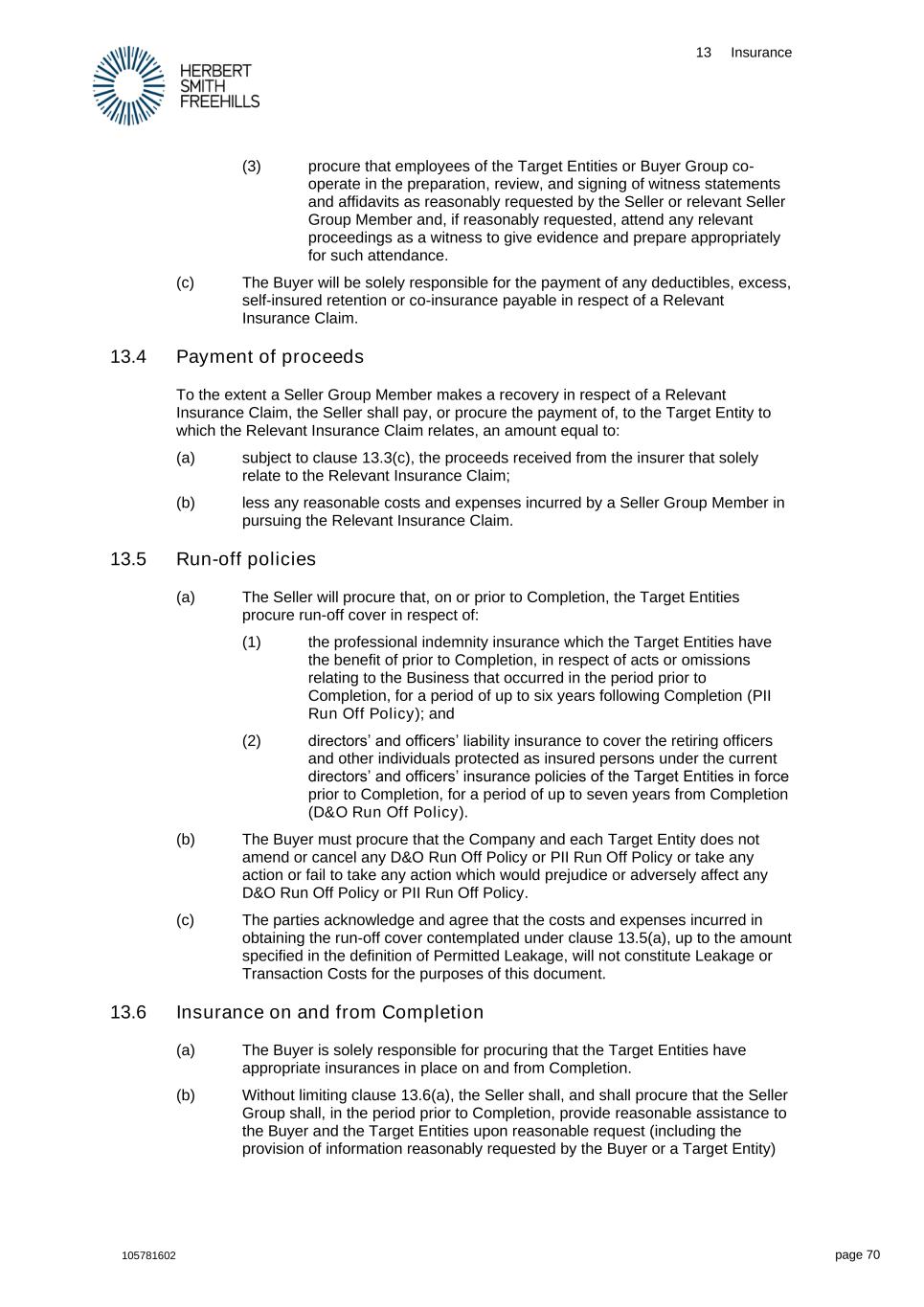 13 Insurance 105781602 page 70 (3) procure that employees of the Target Entities or Buyer Group co- operate in the preparation, review, and signing of witness statements and affidavits as reasonably requested by the Seller or relevant Seller Group Member and, if reasonably requested, attend any relevant proceedings as a witness to give evidence and prepare appropriately for such attendance. (c) The Buyer will be solely responsible for the payment of any deductibles, excess, self-insured retention or co-insurance payable in respect of a Relevant Insurance Claim. 13.4 Payment of proceeds To the extent a Seller Group Member makes a recovery in respect of a Relevant Insurance Claim, the Seller shall pay, or procure the payment of, to the Target Entity to which the Relevant Insurance Claim relates, an amount equal to: (a) subject to clause 13.3(c), the proceeds received from the insurer that solely relate to the Relevant Insurance Claim; (b) less any reasonable costs and expenses incurred by a Seller Group Member in pursuing the Relevant Insurance Claim. 13.5 Run-off policies (a) The Seller will procure that, on or prior to Completion, the Target Entities procure run-off cover in respect of: (1) the professional indemnity insurance which the Target Entities have the benefit of prior to Completion, in respect of acts or omissions relating to the Business that occurred in the period prior to Completion, for a period of up to six years following Completion (PII Run Off Policy); and (2) directors’ and officers’ liability insurance to cover the retiring officers and other individuals protected as insured persons under the current directors’ and officers’ insurance policies of the Target Entities in force prior to Completion, for a period of up to seven years from Completion (D&O Run Off Policy). (b) The Buyer must procure that the Company and each Target Entity does not amend or cancel any D&O Run Off Policy or PII Run Off Policy or take any action or fail to take any action which would prejudice or adversely affect any D&O Run Off Policy or PII Run Off Policy. (c) The parties acknowledge and agree that the costs and expenses incurred in obtaining the run-off cover contemplated under clause 13.5(a), up to the amount specified in the definition of Permitted Leakage, will not constitute Leakage or Transaction Costs for the purposes of this document. 13.6 Insurance on and from Completion (a) The Buyer is solely responsible for procuring that the Target Entities have appropriate insurances in place on and from Completion. (b) Without limiting clause 13.6(a), the Seller shall, and shall procure that the Seller Group shall, in the period prior to Completion, provide reasonable assistance to the Buyer and the Target Entities upon reasonable request (including the provision of information reasonably requested by the Buyer or a Target Entity)