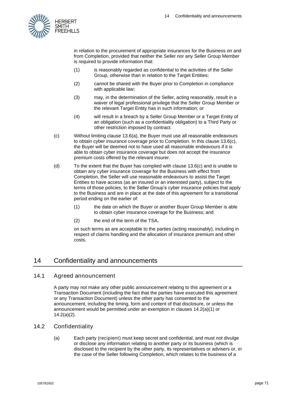 14 Confidentiality and announcements 105781602 page 71 in relation to the procurement of appropriate insurances for the Business on and from Completion, provided that neither the Seller nor any Seller Group Member is required to provide information that: (1) is reasonably regarded as confidential to the activities of the Seller Group, otherwise than in relation to the Target Entities; (2) cannot be shared with the Buyer prior to Completion in compliance with applicable law; (3) may, in the determination of the Seller, acting reasonably, result in a waiver of legal professional privilege that the Seller Group Member or the relevant Target Entity has in such information; or (4) will result in a breach by a Seller Group Member or a Target Entity of an obligation (such as a confidentiality obligation) to a Third Party or other restriction imposed by contract. (c) Without limiting clause 13.6(a), the Buyer must use all reasonable endeavours to obtain cyber insurance coverage prior to Completion. In this clause 13.6(c), the Buyer will be deemed not to have used all reasonable endeavours if it is able to obtain cyber insurance coverage but does not accept the insurance premium costs offered by the relevant insurer. (d) To the extent that the Buyer has complied with clause 13.6(c) and is unable to obtain any cyber insurance coverage for the Business with effect from Completion, the Seller will use reasonable endeavours to assist the Target Entities to have access (as an insured or an interested party), subject to the terms of those policies, to the Seller Group’s cyber insurance policies that apply to the Business and are in place at the date of this agreement for a transitional period ending on the earlier of: (1) the date on which the Buyer or another Buyer Group Member is able to obtain cyber insurance coverage for the Business; and (2) the end of the term of the TSA, on such terms as are acceptable to the parties (acting reasonably), including in respect of claims handling and the allocation of insurance premium and other costs. 14 Confidentiality and announcements 14.1 Agreed announcement A party may not make any other public announcement relating to this agreement or a Transaction Document (including the fact that the parties have executed this agreement or any Transaction Document) unless the other party has consented to the announcement, including the timing, form and content of that disclosure, or unless the announcement would be permitted under an exemption in clauses 14.2(a)(1) or 14.2(a)(2). 14.2 Confidentiality (a) Each party (recipient) must keep secret and confidential, and must not divulge or disclose any information relating to another party or its business (which is disclosed to the recipient by the other party, its representatives or advisers or, in the case of the Seller following Completion, which relates to the business of a