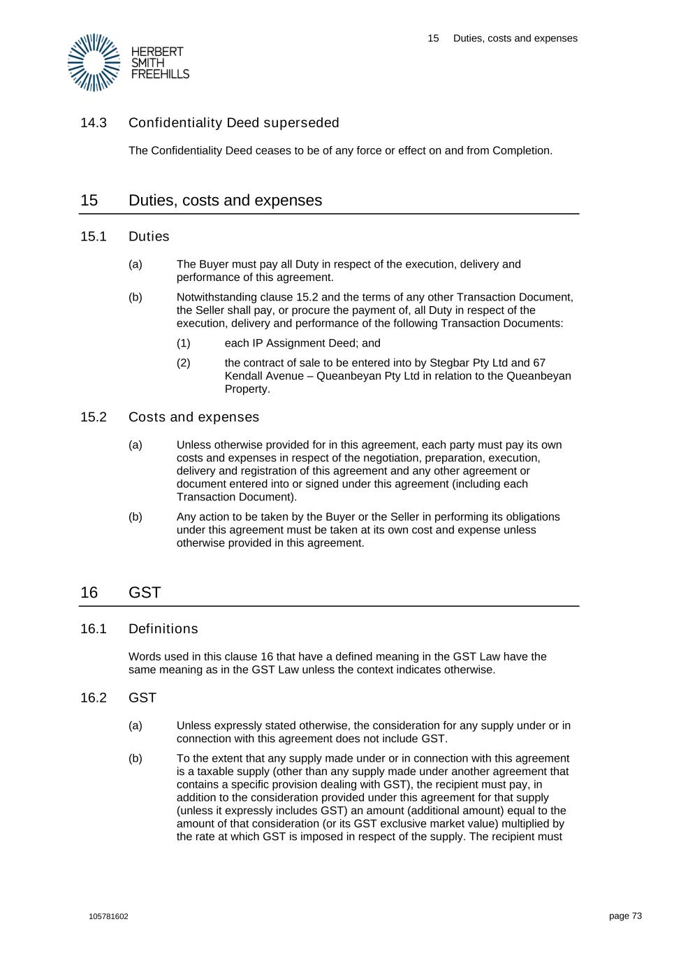 15 Duties, costs and expenses 105781602 page 73 14.3 Confidentiality Deed superseded The Confidentiality Deed ceases to be of any force or effect on and from Completion. 15 Duties, costs and expenses 15.1 Duties (a) The Buyer must pay all Duty in respect of the execution, delivery and performance of this agreement. (b) Notwithstanding clause 15.2 and the terms of any other Transaction Document, the Seller shall pay, or procure the payment of, all Duty in respect of the execution, delivery and performance of the following Transaction Documents: (1) each IP Assignment Deed; and (2) the contract of sale to be entered into by Stegbar Pty Ltd and 67 Kendall Avenue – Queanbeyan Pty Ltd in relation to the Queanbeyan Property. 15.2 Costs and expenses (a) Unless otherwise provided for in this agreement, each party must pay its own costs and expenses in respect of the negotiation, preparation, execution, delivery and registration of this agreement and any other agreement or document entered into or signed under this agreement (including each Transaction Document). (b) Any action to be taken by the Buyer or the Seller in performing its obligations under this agreement must be taken at its own cost and expense unless otherwise provided in this agreement. 16 GST 16.1 Definitions Words used in this clause 16 that have a defined meaning in the GST Law have the same meaning as in the GST Law unless the context indicates otherwise. 16.2 GST (a) Unless expressly stated otherwise, the consideration for any supply under or in connection with this agreement does not include GST. (b) To the extent that any supply made under or in connection with this agreement is a taxable supply (other than any supply made under another agreement that contains a specific provision dealing with GST), the recipient must pay, in addition to the consideration provided under this agreement for that supply (unless it expressly includes GST) an amount (additional amount) equal to the amount of that consideration (or its GST exclusive market value) multiplied by the rate at which GST is imposed in respect of the supply. The recipient must