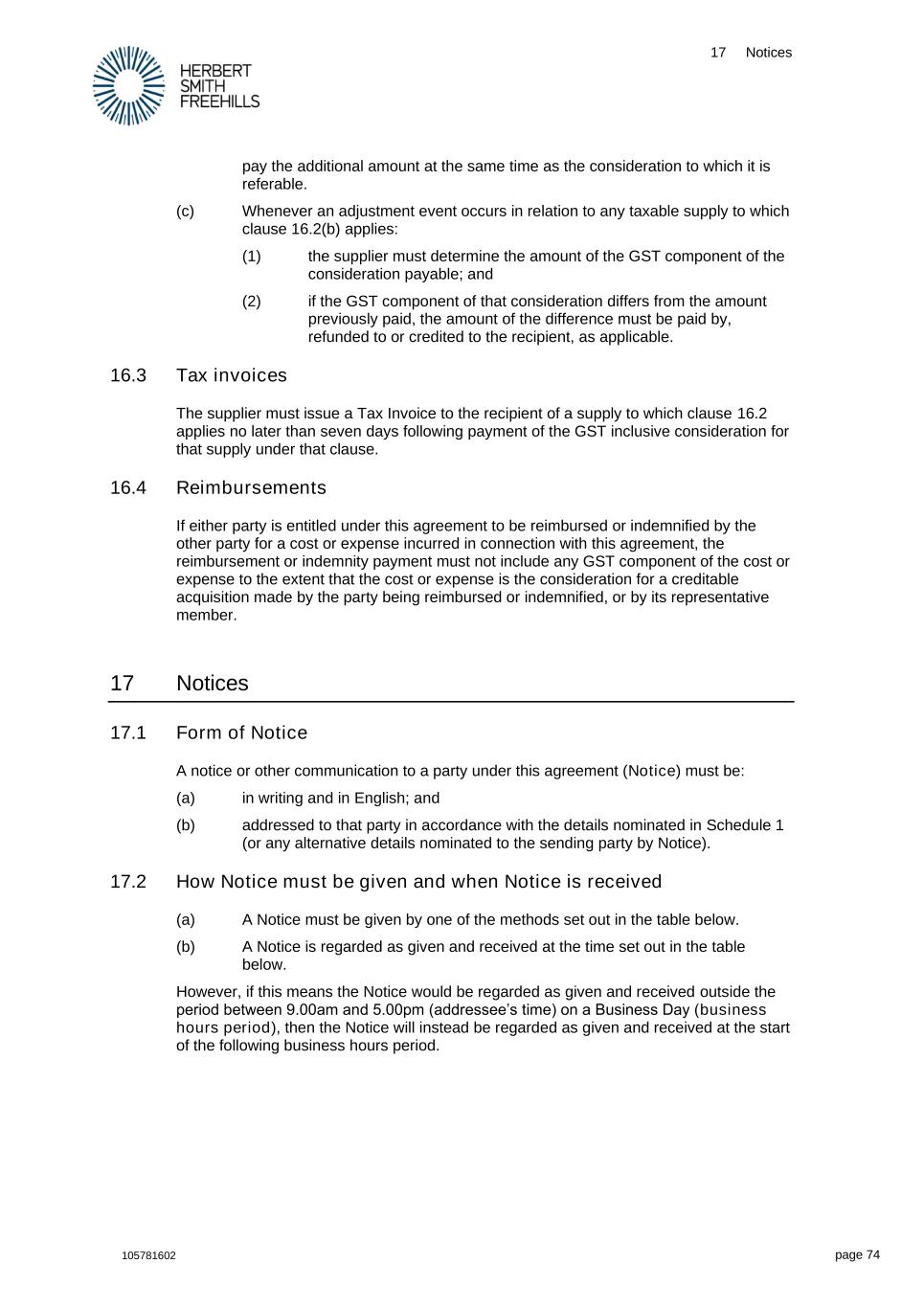 17 Notices 105781602 page 74 pay the additional amount at the same time as the consideration to which it is referable. (c) Whenever an adjustment event occurs in relation to any taxable supply to which clause 16.2(b) applies: (1) the supplier must determine the amount of the GST component of the consideration payable; and (2) if the GST component of that consideration differs from the amount previously paid, the amount of the difference must be paid by, refunded to or credited to the recipient, as applicable. 16.3 Tax invoices The supplier must issue a Tax Invoice to the recipient of a supply to which clause 16.2 applies no later than seven days following payment of the GST inclusive consideration for that supply under that clause. 16.4 Reimbursements If either party is entitled under this agreement to be reimbursed or indemnified by the other party for a cost or expense incurred in connection with this agreement, the reimbursement or indemnity payment must not include any GST component of the cost or expense to the extent that the cost or expense is the consideration for a creditable acquisition made by the party being reimbursed or indemnified, or by its representative member. 17 Notices 17.1 Form of Notice A notice or other communication to a party under this agreement (Notice) must be: (a) in writing and in English; and (b) addressed to that party in accordance with the details nominated in Schedule 1 (or any alternative details nominated to the sending party by Notice). 17.2 How Notice must be given and when Notice is received (a) A Notice must be given by one of the methods set out in the table below. (b) A Notice is regarded as given and received at the time set out in the table below. However, if this means the Notice would be regarded as given and received outside the period between 9.00am and 5.00pm (addressee’s time) on a Business Day (business hours period), then the Notice will instead be regarded as given and received at the start of the following business hours period.