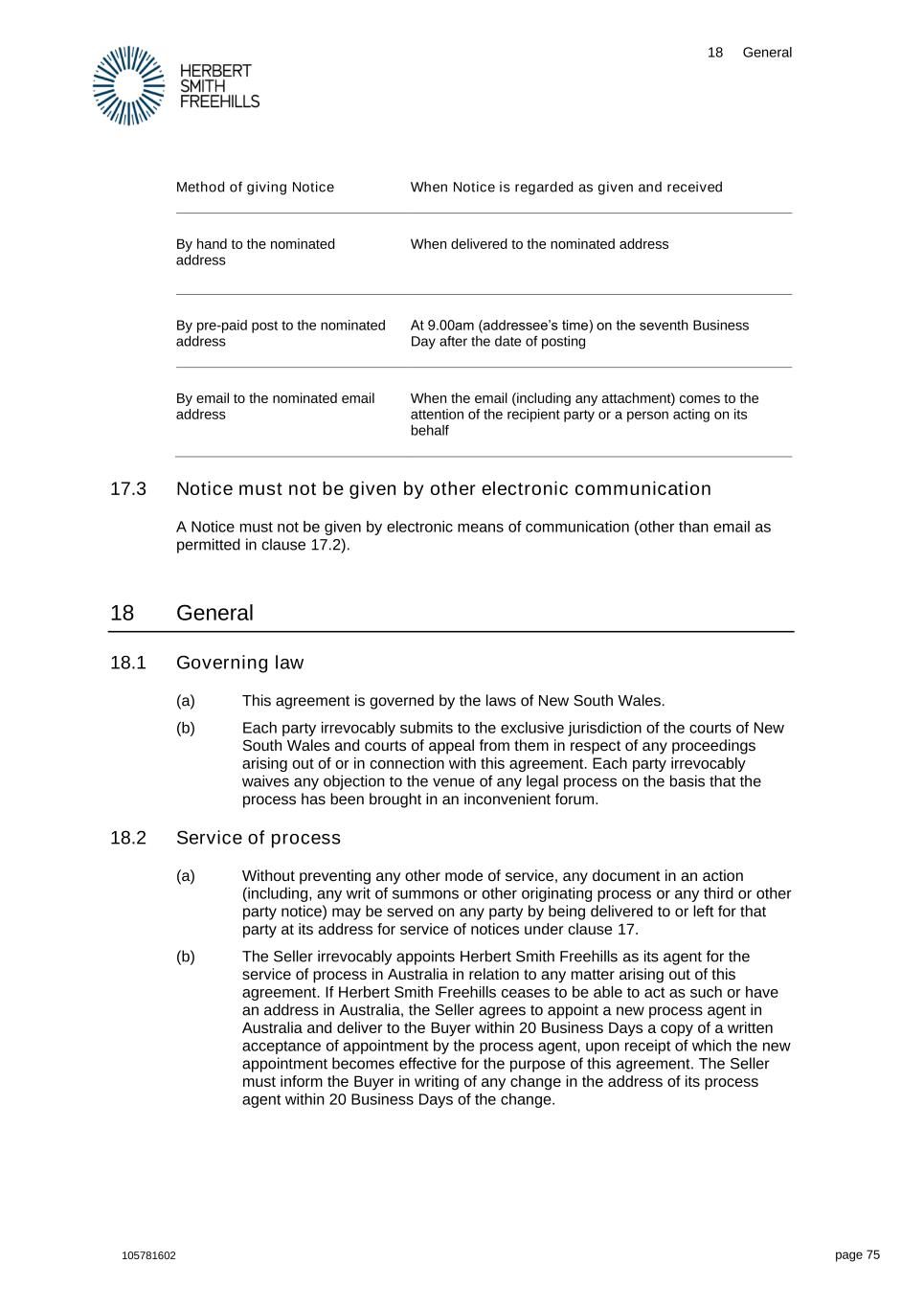 18 General 105781602 page 75 Method of giving Notice When Notice is regarded as given and received By hand to the nominated address When delivered to the nominated address By pre-paid post to the nominated address At 9.00am (addressee’s time) on the seventh Business Day after the date of posting By email to the nominated email address When the email (including any attachment) comes to the attention of the recipient party or a person acting on its behalf 17.3 Notice must not be given by other electronic communication A Notice must not be given by electronic means of communication (other than email as permitted in clause 17.2). 18 General 18.1 Governing law (a) This agreement is governed by the laws of New South Wales. (b) Each party irrevocably submits to the exclusive jurisdiction of the courts of New South Wales and courts of appeal from them in respect of any proceedings arising out of or in connection with this agreement. Each party irrevocably waives any objection to the venue of any legal process on the basis that the process has been brought in an inconvenient forum. 18.2 Service of process (a) Without preventing any other mode of service, any document in an action (including, any writ of summons or other originating process or any third or other party notice) may be served on any party by being delivered to or left for that party at its address for service of notices under clause 17. (b) The Seller irrevocably appoints Herbert Smith Freehills as its agent for the service of process in Australia in relation to any matter arising out of this agreement. If Herbert Smith Freehills ceases to be able to act as such or have an address in Australia, the Seller agrees to appoint a new process agent in Australia and deliver to the Buyer within 20 Business Days a copy of a written acceptance of appointment by the process agent, upon receipt of which the new appointment becomes effective for the purpose of this agreement. The Seller must inform the Buyer in writing of any change in the address of its process agent within 20 Business Days of the change.