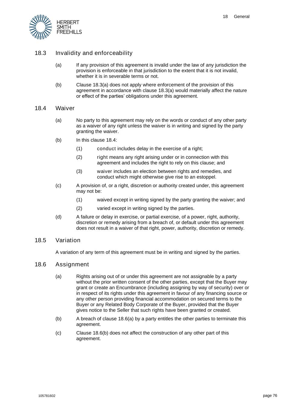 18 General 105781602 page 76 18.3 Invalidity and enforceability (a) If any provision of this agreement is invalid under the law of any jurisdiction the provision is enforceable in that jurisdiction to the extent that it is not invalid, whether it is in severable terms or not. (b) Clause 18.3(a) does not apply where enforcement of the provision of this agreement in accordance with clause 18.3(a) would materially affect the nature or effect of the parties’ obligations under this agreement. 18.4 Waiver (a) No party to this agreement may rely on the words or conduct of any other party as a waiver of any right unless the waiver is in writing and signed by the party granting the waiver. (b) In this clause 18.4: (1) conduct includes delay in the exercise of a right; (2) right means any right arising under or in connection with this agreement and includes the right to rely on this clause; and (3) waiver includes an election between rights and remedies, and conduct which might otherwise give rise to an estoppel. (c) A provision of, or a right, discretion or authority created under, this agreement may not be: (1) waived except in writing signed by the party granting the waiver; and (2) varied except in writing signed by the parties. (d) A failure or delay in exercise, or partial exercise, of a power, right, authority, discretion or remedy arising from a breach of, or default under this agreement does not result in a waiver of that right, power, authority, discretion or remedy. 18.5 Variation A variation of any term of this agreement must be in writing and signed by the parties. 18.6 Assignment (a) Rights arising out of or under this agreement are not assignable by a party without the prior written consent of the other parties, except that the Buyer may grant or create an Encumbrance (including assigning by way of security) over or in respect of its rights under this agreement in favour of any financing source or any other person providing financial accommodation on secured terms to the Buyer or any Related Body Corporate of the Buyer, provided that the Buyer gives notice to the Seller that such rights have been granted or created. (b) A breach of clause 18.6(a) by a party entitles the other parties to terminate this agreement. (c) Clause 18.6(b) does not affect the construction of any other part of this agreement.
