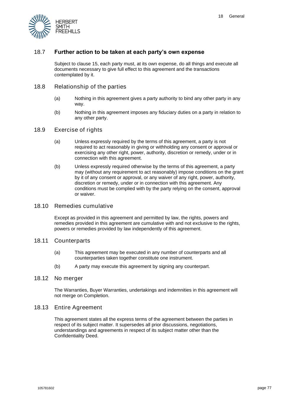 18 General 105781602 page 77 18.7 Further action to be taken at each party’s own expense Subject to clause 15, each party must, at its own expense, do all things and execute all documents necessary to give full effect to this agreement and the transactions contemplated by it. 18.8 Relationship of the parties (a) Nothing in this agreement gives a party authority to bind any other party in any way. (b) Nothing in this agreement imposes any fiduciary duties on a party in relation to any other party. 18.9 Exercise of rights (a) Unless expressly required by the terms of this agreement, a party is not required to act reasonably in giving or withholding any consent or approval or exercising any other right, power, authority, discretion or remedy, under or in connection with this agreement. (b) Unless expressly required otherwise by the terms of this agreement, a party may (without any requirement to act reasonably) impose conditions on the grant by it of any consent or approval, or any waiver of any right, power, authority, discretion or remedy, under or in connection with this agreement. Any conditions must be complied with by the party relying on the consent, approval or waiver. 18.10 Remedies cumulative Except as provided in this agreement and permitted by law, the rights, powers and remedies provided in this agreement are cumulative with and not exclusive to the rights, powers or remedies provided by law independently of this agreement. 18.11 Counterparts (a) This agreement may be executed in any number of counterparts and all counterparties taken together constitute one instrument. (b) A party may execute this agreement by signing any counterpart. 18.12 No merger The Warranties, Buyer Warranties, undertakings and indemnities in this agreement will not merge on Completion. 18.13 Entire Agreement This agreement states all the express terms of the agreement between the parties in respect of its subject matter. It supersedes all prior discussions, negotiations, understandings and agreements in respect of its subject matter other than the Confidentiality Deed.