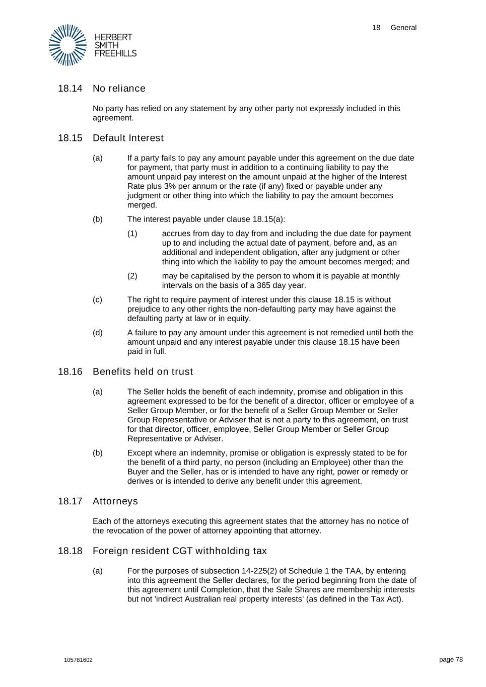 18 General 105781602 page 78 18.14 No reliance No party has relied on any statement by any other party not expressly included in this agreement. 18.15 Default Interest (a) If a party fails to pay any amount payable under this agreement on the due date for payment, that party must in addition to a continuing liability to pay the amount unpaid pay interest on the amount unpaid at the higher of the Interest Rate plus 3% per annum or the rate (if any) fixed or payable under any judgment or other thing into which the liability to pay the amount becomes merged. (b) The interest payable under clause 18.15(a): (1) accrues from day to day from and including the due date for payment up to and including the actual date of payment, before and, as an additional and independent obligation, after any judgment or other thing into which the liability to pay the amount becomes merged; and (2) may be capitalised by the person to whom it is payable at monthly intervals on the basis of a 365 day year. (c) The right to require payment of interest under this clause 18.15 is without prejudice to any other rights the non-defaulting party may have against the defaulting party at law or in equity. (d) A failure to pay any amount under this agreement is not remedied until both the amount unpaid and any interest payable under this clause 18.15 have been paid in full. 18.16 Benefits held on trust (a) The Seller holds the benefit of each indemnity, promise and obligation in this agreement expressed to be for the benefit of a director, officer or employee of a Seller Group Member, or for the benefit of a Seller Group Member or Seller Group Representative or Adviser that is not a party to this agreement, on trust for that director, officer, employee, Seller Group Member or Seller Group Representative or Adviser. (b) Except where an indemnity, promise or obligation is expressly stated to be for the benefit of a third party, no person (including an Employee) other than the Buyer and the Seller, has or is intended to have any right, power or remedy or derives or is intended to derive any benefit under this agreement. 18.17 Attorneys Each of the attorneys executing this agreement states that the attorney has no notice of the revocation of the power of attorney appointing that attorney. 18.18 Foreign resident CGT withholding tax (a) For the purposes of subsection 14-225(2) of Schedule 1 the TAA, by entering into this agreement the Seller declares, for the period beginning from the date of this agreement until Completion, that the Sale Shares are membership interests but not 'indirect Australian real property interests' (as defined in the Tax Act).