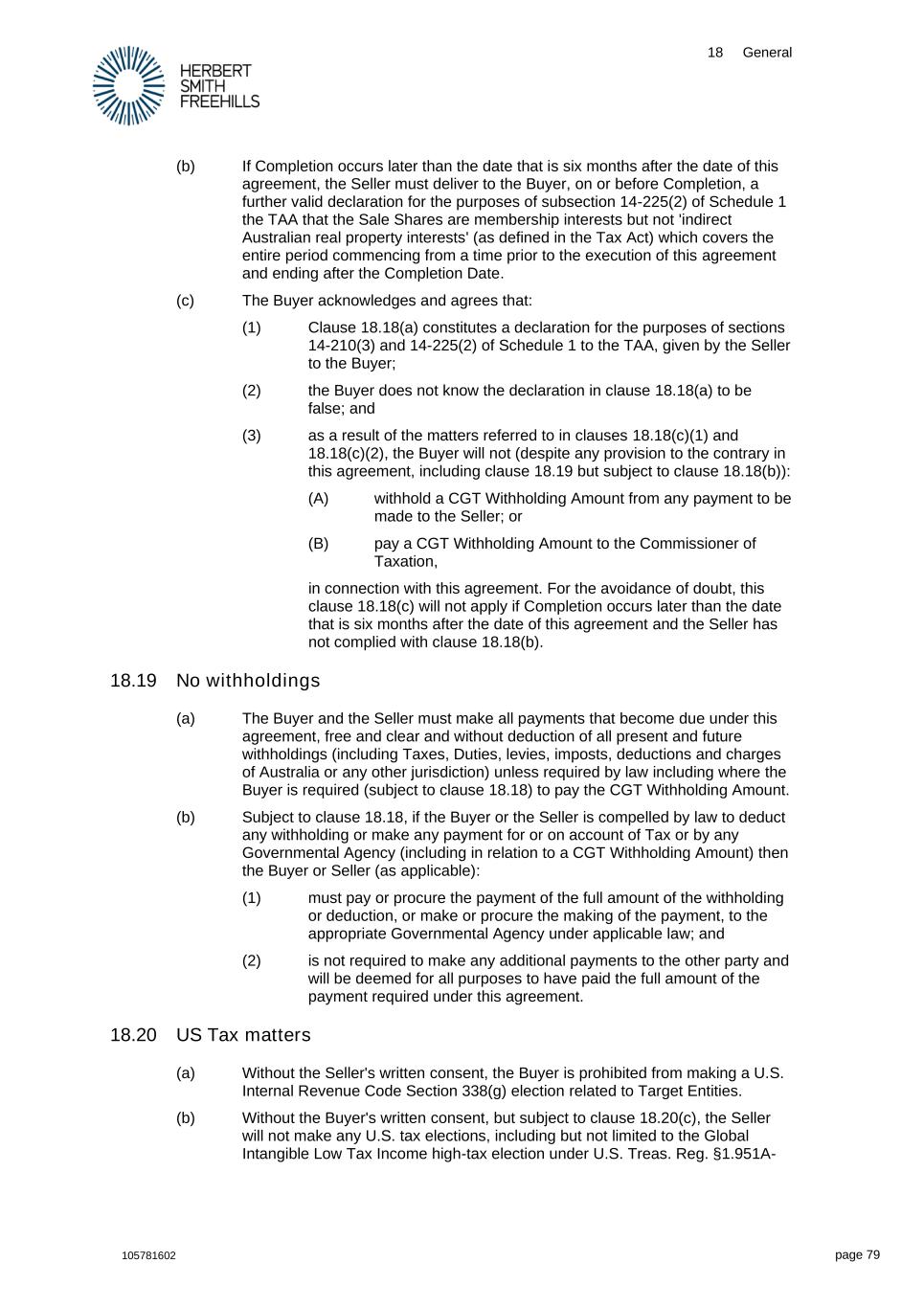 18 General 105781602 page 79 (b) If Completion occurs later than the date that is six months after the date of this agreement, the Seller must deliver to the Buyer, on or before Completion, a further valid declaration for the purposes of subsection 14-225(2) of Schedule 1 the TAA that the Sale Shares are membership interests but not 'indirect Australian real property interests' (as defined in the Tax Act) which covers the entire period commencing from a time prior to the execution of this agreement and ending after the Completion Date. (c) The Buyer acknowledges and agrees that: (1) Clause 18.18(a) constitutes a declaration for the purposes of sections 14-210(3) and 14-225(2) of Schedule 1 to the TAA, given by the Seller to the Buyer; (2) the Buyer does not know the declaration in clause 18.18(a) to be false; and (3) as a result of the matters referred to in clauses 18.18(c)(1) and 18.18(c)(2), the Buyer will not (despite any provision to the contrary in this agreement, including clause 18.19 but subject to clause 18.18(b)): (A) withhold a CGT Withholding Amount from any payment to be made to the Seller; or (B) pay a CGT Withholding Amount to the Commissioner of Taxation, in connection with this agreement. For the avoidance of doubt, this clause 18.18(c) will not apply if Completion occurs later than the date that is six months after the date of this agreement and the Seller has not complied with clause 18.18(b). 18.19 No withholdings (a) The Buyer and the Seller must make all payments that become due under this agreement, free and clear and without deduction of all present and future withholdings (including Taxes, Duties, levies, imposts, deductions and charges of Australia or any other jurisdiction) unless required by law including where the Buyer is required (subject to clause 18.18) to pay the CGT Withholding Amount. (b) Subject to clause 18.18, if the Buyer or the Seller is compelled by law to deduct any withholding or make any payment for or on account of Tax or by any Governmental Agency (including in relation to a CGT Withholding Amount) then the Buyer or Seller (as applicable): (1) must pay or procure the payment of the full amount of the withholding or deduction, or make or procure the making of the payment, to the appropriate Governmental Agency under applicable law; and (2) is not required to make any additional payments to the other party and will be deemed for all purposes to have paid the full amount of the payment required under this agreement. 18.20 US Tax matters (a) Without the Seller's written consent, the Buyer is prohibited from making a U.S. Internal Revenue Code Section 338(g) election related to Target Entities. (b) Without the Buyer's written consent, but subject to clause 18.20(c), the Seller will not make any U.S. tax elections, including but not limited to the Global Intangible Low Tax Income high-tax election under U.S. Treas. Reg. §1.951A-