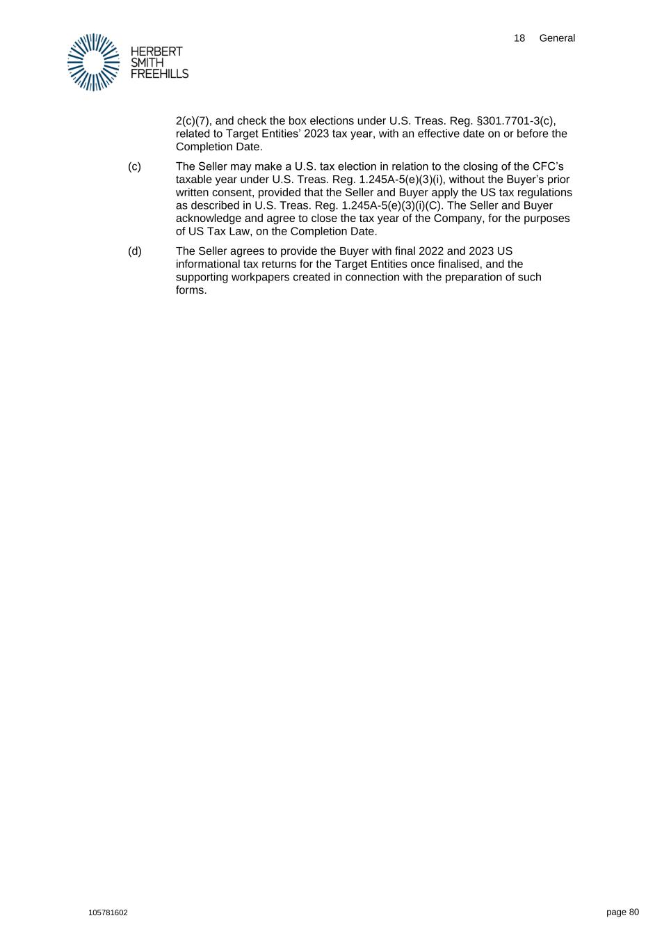 18 General 105781602 page 80 2(c)(7), and check the box elections under U.S. Treas. Reg. §301.7701-3(c), related to Target Entities’ 2023 tax year, with an effective date on or before the Completion Date. (c) The Seller may make a U.S. tax election in relation to the closing of the CFC’s taxable year under U.S. Treas. Reg. 1.245A-5(e)(3)(i), without the Buyer’s prior written consent, provided that the Seller and Buyer apply the US tax regulations as described in U.S. Treas. Reg. 1.245A-5(e)(3)(i)(C). The Seller and Buyer acknowledge and agree to close the tax year of the Company, for the purposes of US Tax Law, on the Completion Date. (d) The Seller agrees to provide the Buyer with final 2022 and 2023 US informational tax returns for the Target Entities once finalised, and the supporting workpapers created in connection with the preparation of such forms.