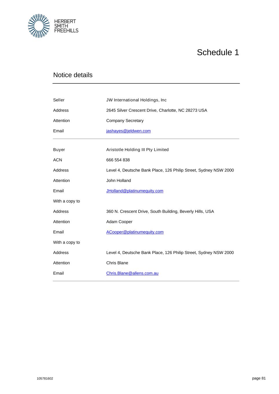 105781602 page 81 Schedule 1 Notice details Seller JW International Holdings, Inc Address 2645 Silver Crescent Drive, Charlotte, NC 28273 USA Attention Company Secretary Email jashayes@jeldwen.com Buyer Aristotle Holding III Pty Limited ACN 666 554 838 Address Level 4, Deutsche Bank Place, 126 Philip Street, Sydney NSW 2000 Attention John Holland Email JHolland@platinumequity.com With a copy to Address 360 N. Crescent Drive, South Building, Beverly Hills, USA Attention Adam Cooper Email ACooper@platinumequity.com With a copy to Address Level 4, Deutsche Bank Place, 126 Philip Street, Sydney NSW 2000 Attention Chris Blane Email Chris.Blane@allens.com.au