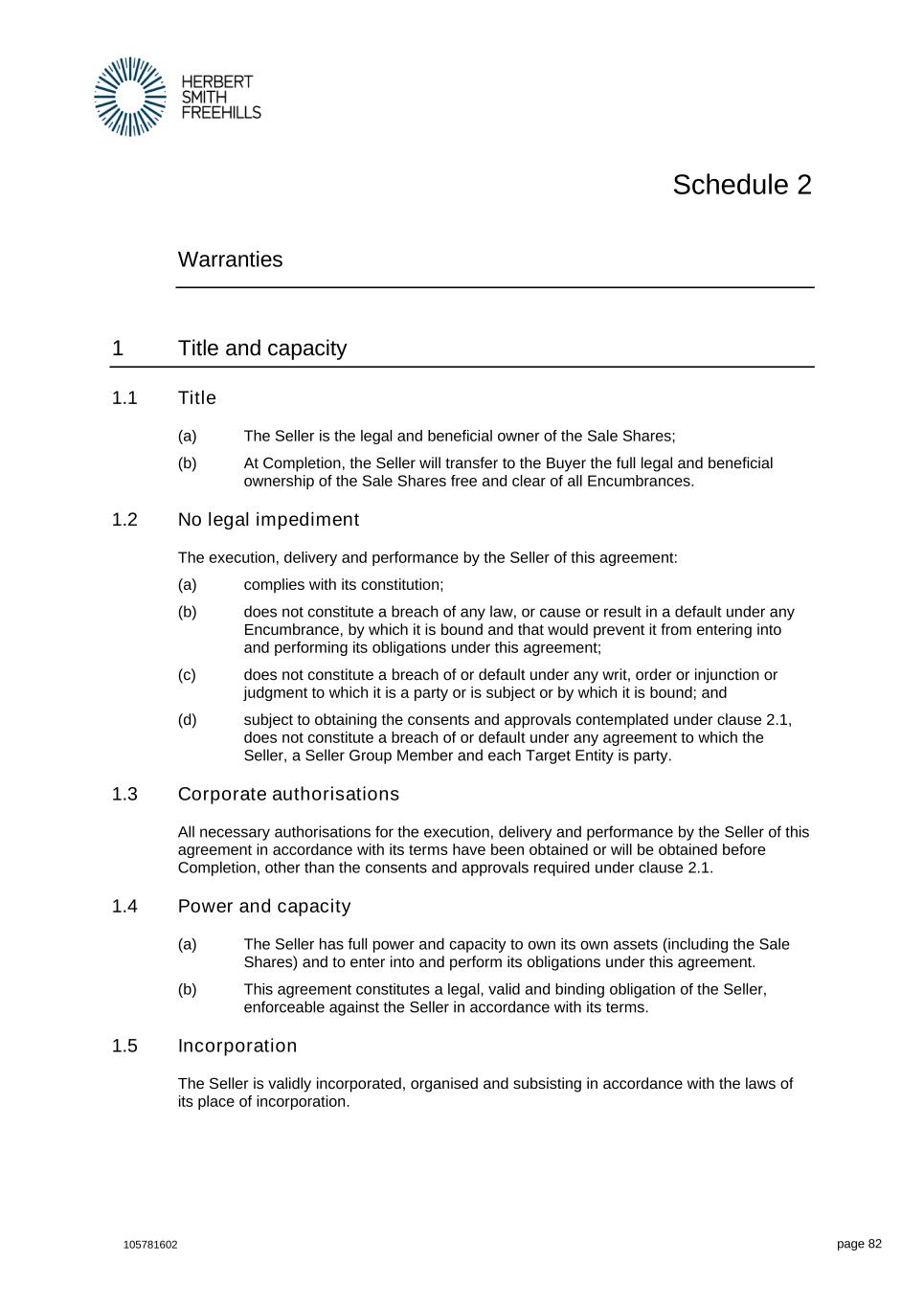 105781602 page 82 Schedule 2 Warranties 1 Title and capacity 1.1 Title (a) The Seller is the legal and beneficial owner of the Sale Shares; (b) At Completion, the Seller will transfer to the Buyer the full legal and beneficial ownership of the Sale Shares free and clear of all Encumbrances. 1.2 No legal impediment The execution, delivery and performance by the Seller of this agreement: (a) complies with its constitution; (b) does not constitute a breach of any law, or cause or result in a default under any Encumbrance, by which it is bound and that would prevent it from entering into and performing its obligations under this agreement; (c) does not constitute a breach of or default under any writ, order or injunction or judgment to which it is a party or is subject or by which it is bound; and (d) subject to obtaining the consents and approvals contemplated under clause 2.1, does not constitute a breach of or default under any agreement to which the Seller, a Seller Group Member and each Target Entity is party. 1.3 Corporate authorisations All necessary authorisations for the execution, delivery and performance by the Seller of this agreement in accordance with its terms have been obtained or will be obtained before Completion, other than the consents and approvals required under clause 2.1. 1.4 Power and capacity (a) The Seller has full power and capacity to own its own assets (including the Sale Shares) and to enter into and perform its obligations under this agreement. (b) This agreement constitutes a legal, valid and binding obligation of the Seller, enforceable against the Seller in accordance with its terms. 1.5 Incorporation The Seller is validly incorporated, organised and subsisting in accordance with the laws of its place of incorporation.