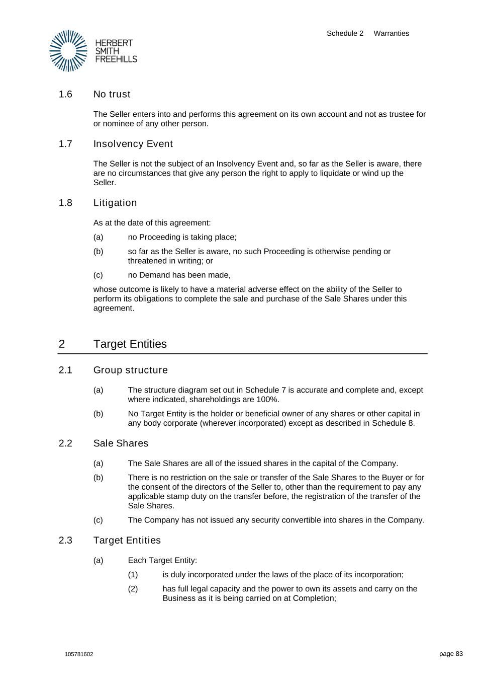 Schedule 2 Warranties 105781602 page 83 1.6 No trust The Seller enters into and performs this agreement on its own account and not as trustee for or nominee of any other person. 1.7 Insolvency Event The Seller is not the subject of an Insolvency Event and, so far as the Seller is aware, there are no circumstances that give any person the right to apply to liquidate or wind up the Seller. 1.8 Litigation As at the date of this agreement: (a) no Proceeding is taking place; (b) so far as the Seller is aware, no such Proceeding is otherwise pending or threatened in writing; or (c) no Demand has been made, whose outcome is likely to have a material adverse effect on the ability of the Seller to perform its obligations to complete the sale and purchase of the Sale Shares under this agreement. 2 Target Entities 2.1 Group structure (a) The structure diagram set out in Schedule 7 is accurate and complete and, except where indicated, shareholdings are 100%. (b) No Target Entity is the holder or beneficial owner of any shares or other capital in any body corporate (wherever incorporated) except as described in Schedule 8. 2.2 Sale Shares (a) The Sale Shares are all of the issued shares in the capital of the Company. (b) There is no restriction on the sale or transfer of the Sale Shares to the Buyer or for the consent of the directors of the Seller to, other than the requirement to pay any applicable stamp duty on the transfer before, the registration of the transfer of the Sale Shares. (c) The Company has not issued any security convertible into shares in the Company. 2.3 Target Entities (a) Each Target Entity: (1) is duly incorporated under the laws of the place of its incorporation; (2) has full legal capacity and the power to own its assets and carry on the Business as it is being carried on at Completion;