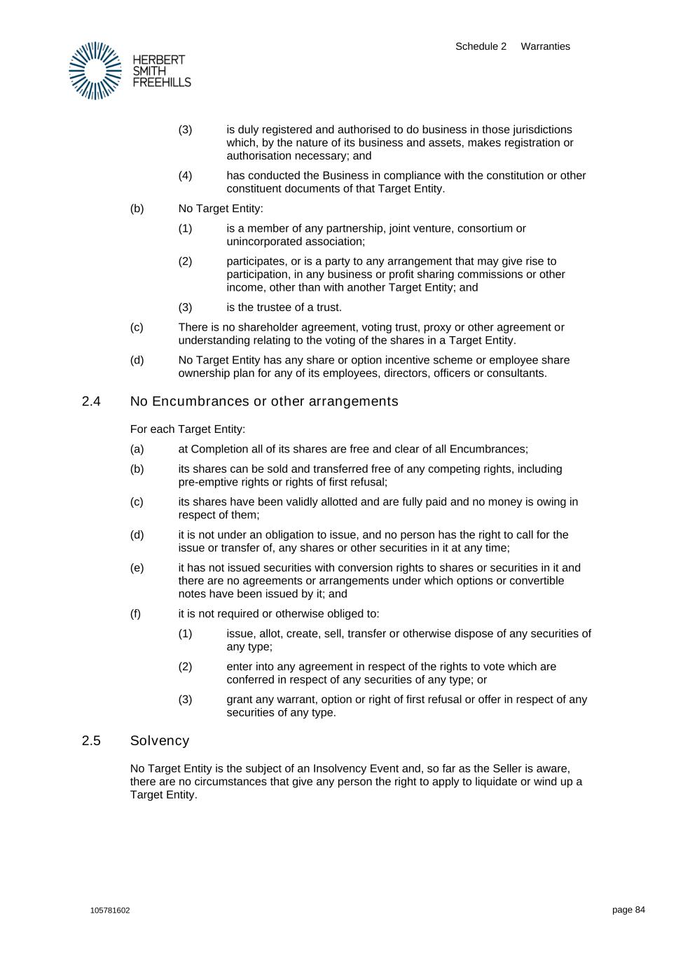 Schedule 2 Warranties 105781602 page 84 (3) is duly registered and authorised to do business in those jurisdictions which, by the nature of its business and assets, makes registration or authorisation necessary; and (4) has conducted the Business in compliance with the constitution or other constituent documents of that Target Entity. (b) No Target Entity: (1) is a member of any partnership, joint venture, consortium or unincorporated association; (2) participates, or is a party to any arrangement that may give rise to participation, in any business or profit sharing commissions or other income, other than with another Target Entity; and (3) is the trustee of a trust. (c) There is no shareholder agreement, voting trust, proxy or other agreement or understanding relating to the voting of the shares in a Target Entity. (d) No Target Entity has any share or option incentive scheme or employee share ownership plan for any of its employees, directors, officers or consultants. 2.4 No Encumbrances or other arrangements For each Target Entity: (a) at Completion all of its shares are free and clear of all Encumbrances; (b) its shares can be sold and transferred free of any competing rights, including pre-emptive rights or rights of first refusal; (c) its shares have been validly allotted and are fully paid and no money is owing in respect of them; (d) it is not under an obligation to issue, and no person has the right to call for the issue or transfer of, any shares or other securities in it at any time; (e) it has not issued securities with conversion rights to shares or securities in it and there are no agreements or arrangements under which options or convertible notes have been issued by it; and (f) it is not required or otherwise obliged to: (1) issue, allot, create, sell, transfer or otherwise dispose of any securities of any type; (2) enter into any agreement in respect of the rights to vote which are conferred in respect of any securities of any type; or (3) grant any warrant, option or right of first refusal or offer in respect of any securities of any type. 2.5 Solvency No Target Entity is the subject of an Insolvency Event and, so far as the Seller is aware, there are no circumstances that give any person the right to apply to liquidate or wind up a Target Entity.