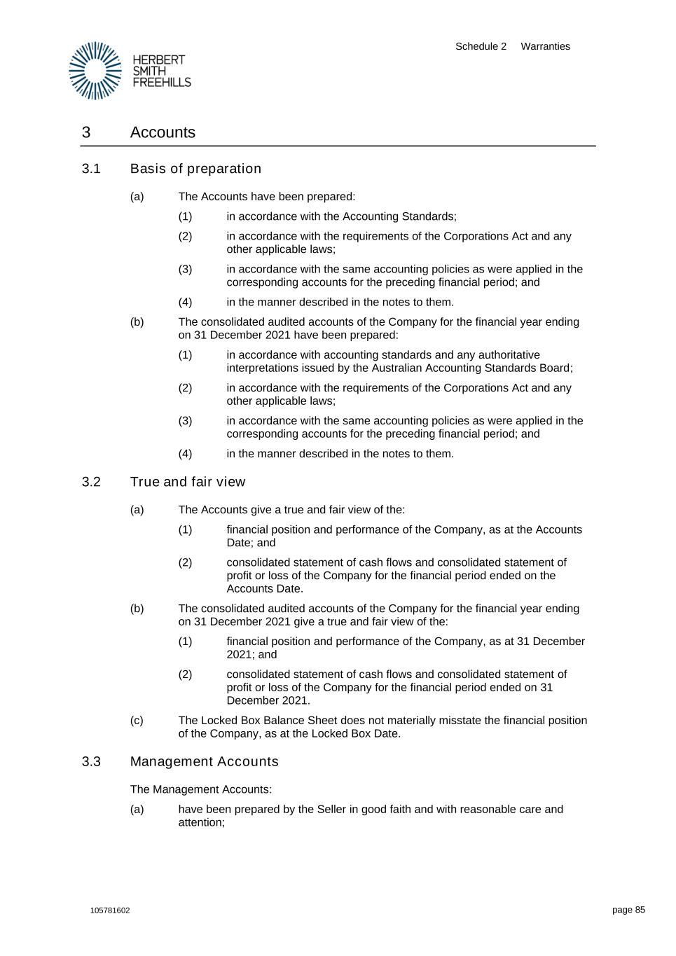 Schedule 2 Warranties 105781602 page 85 3 Accounts 3.1 Basis of preparation (a) The Accounts have been prepared: (1) in accordance with the Accounting Standards; (2) in accordance with the requirements of the Corporations Act and any other applicable laws; (3) in accordance with the same accounting policies as were applied in the corresponding accounts for the preceding financial period; and (4) in the manner described in the notes to them. (b) The consolidated audited accounts of the Company for the financial year ending on 31 December 2021 have been prepared: (1) in accordance with accounting standards and any authoritative interpretations issued by the Australian Accounting Standards Board; (2) in accordance with the requirements of the Corporations Act and any other applicable laws; (3) in accordance with the same accounting policies as were applied in the corresponding accounts for the preceding financial period; and (4) in the manner described in the notes to them. 3.2 True and fair view (a) The Accounts give a true and fair view of the: (1) financial position and performance of the Company, as at the Accounts Date; and (2) consolidated statement of cash flows and consolidated statement of profit or loss of the Company for the financial period ended on the Accounts Date. (b) The consolidated audited accounts of the Company for the financial year ending on 31 December 2021 give a true and fair view of the: (1) financial position and performance of the Company, as at 31 December 2021; and (2) consolidated statement of cash flows and consolidated statement of profit or loss of the Company for the financial period ended on 31 December 2021. (c) The Locked Box Balance Sheet does not materially misstate the financial position of the Company, as at the Locked Box Date. 3.3 Management Accounts The Management Accounts: (a) have been prepared by the Seller in good faith and with reasonable care and attention;