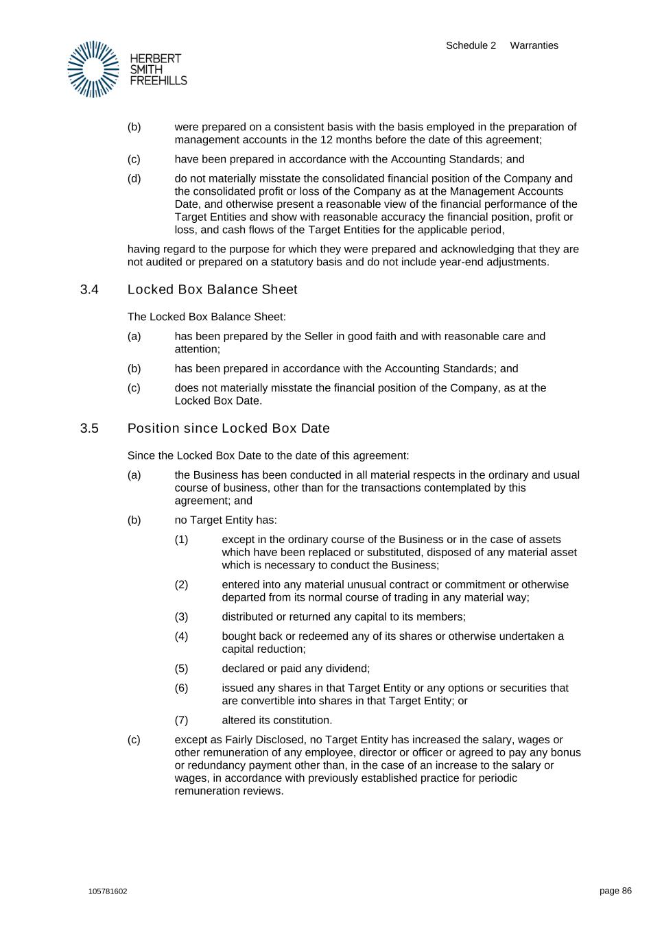 Schedule 2 Warranties 105781602 page 86 (b) were prepared on a consistent basis with the basis employed in the preparation of management accounts in the 12 months before the date of this agreement; (c) have been prepared in accordance with the Accounting Standards; and (d) do not materially misstate the consolidated financial position of the Company and the consolidated profit or loss of the Company as at the Management Accounts Date, and otherwise present a reasonable view of the financial performance of the Target Entities and show with reasonable accuracy the financial position, profit or loss, and cash flows of the Target Entities for the applicable period, having regard to the purpose for which they were prepared and acknowledging that they are not audited or prepared on a statutory basis and do not include year-end adjustments. 3.4 Locked Box Balance Sheet The Locked Box Balance Sheet: (a) has been prepared by the Seller in good faith and with reasonable care and attention; (b) has been prepared in accordance with the Accounting Standards; and (c) does not materially misstate the financial position of the Company, as at the Locked Box Date. 3.5 Position since Locked Box Date Since the Locked Box Date to the date of this agreement: (a) the Business has been conducted in all material respects in the ordinary and usual course of business, other than for the transactions contemplated by this agreement; and (b) no Target Entity has: (1) except in the ordinary course of the Business or in the case of assets which have been replaced or substituted, disposed of any material asset which is necessary to conduct the Business; (2) entered into any material unusual contract or commitment or otherwise departed from its normal course of trading in any material way; (3) distributed or returned any capital to its members; (4) bought back or redeemed any of its shares or otherwise undertaken a capital reduction; (5) declared or paid any dividend; (6) issued any shares in that Target Entity or any options or securities that are convertible into shares in that Target Entity; or (7) altered its constitution. (c) except as Fairly Disclosed, no Target Entity has increased the salary, wages or other remuneration of any employee, director or officer or agreed to pay any bonus or redundancy payment other than, in the case of an increase to the salary or wages, in accordance with previously established practice for periodic remuneration reviews.