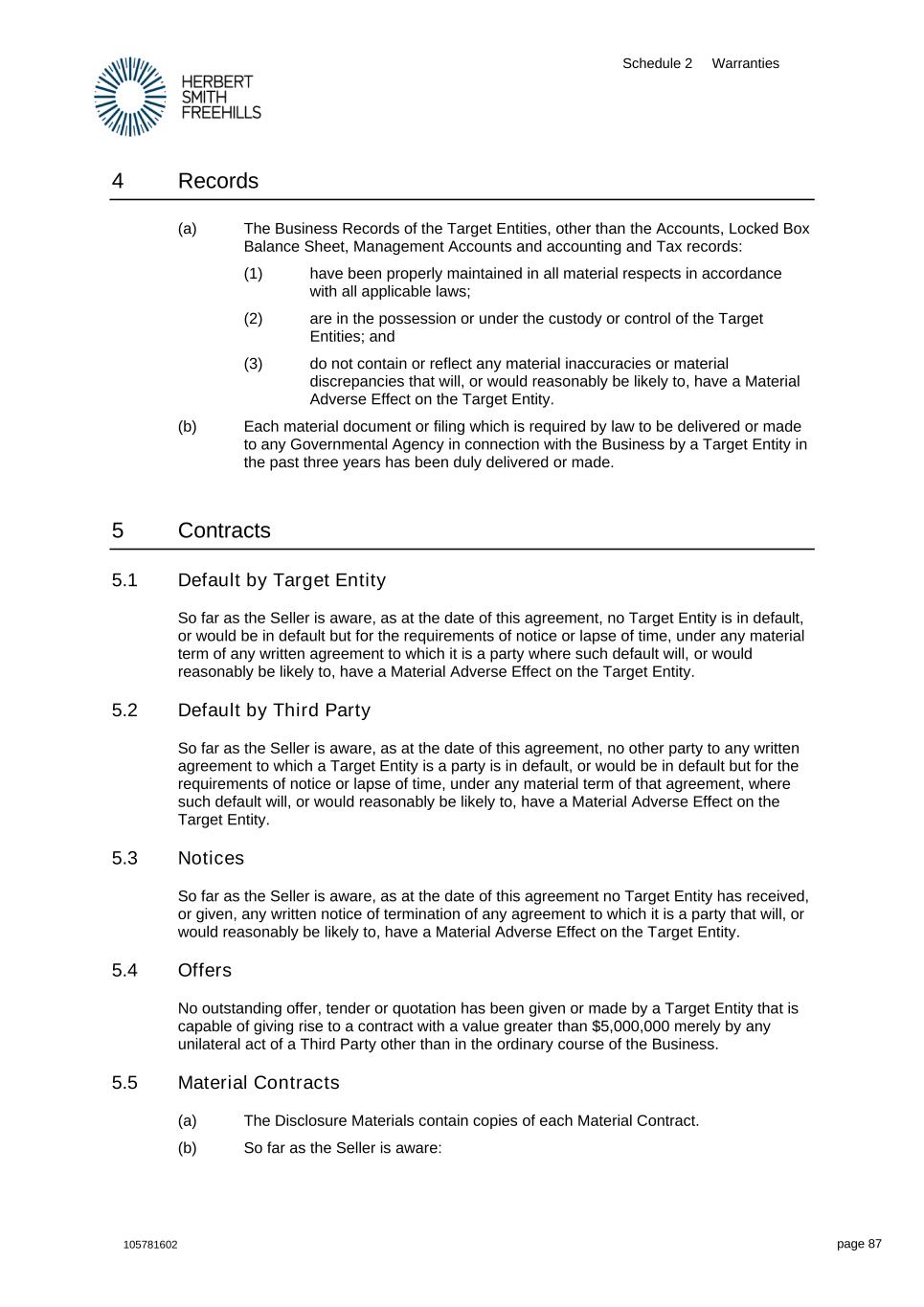 Schedule 2 Warranties 105781602 page 87 4 Records (a) The Business Records of the Target Entities, other than the Accounts, Locked Box Balance Sheet, Management Accounts and accounting and Tax records: (1) have been properly maintained in all material respects in accordance with all applicable laws; (2) are in the possession or under the custody or control of the Target Entities; and (3) do not contain or reflect any material inaccuracies or material discrepancies that will, or would reasonably be likely to, have a Material Adverse Effect on the Target Entity. (b) Each material document or filing which is required by law to be delivered or made to any Governmental Agency in connection with the Business by a Target Entity in the past three years has been duly delivered or made. 5 Contracts 5.1 Default by Target Entity So far as the Seller is aware, as at the date of this agreement, no Target Entity is in default, or would be in default but for the requirements of notice or lapse of time, under any material term of any written agreement to which it is a party where such default will, or would reasonably be likely to, have a Material Adverse Effect on the Target Entity. 5.2 Default by Third Party So far as the Seller is aware, as at the date of this agreement, no other party to any written agreement to which a Target Entity is a party is in default, or would be in default but for the requirements of notice or lapse of time, under any material term of that agreement, where such default will, or would reasonably be likely to, have a Material Adverse Effect on the Target Entity. 5.3 Notices So far as the Seller is aware, as at the date of this agreement no Target Entity has received, or given, any written notice of termination of any agreement to which it is a party that will, or would reasonably be likely to, have a Material Adverse Effect on the Target Entity. 5.4 Offers No outstanding offer, tender or quotation has been given or made by a Target Entity that is capable of giving rise to a contract with a value greater than $5,000,000 merely by any unilateral act of a Third Party other than in the ordinary course of the Business. 5.5 Material Contracts (a) The Disclosure Materials contain copies of each Material Contract. (b) So far as the Seller is aware: