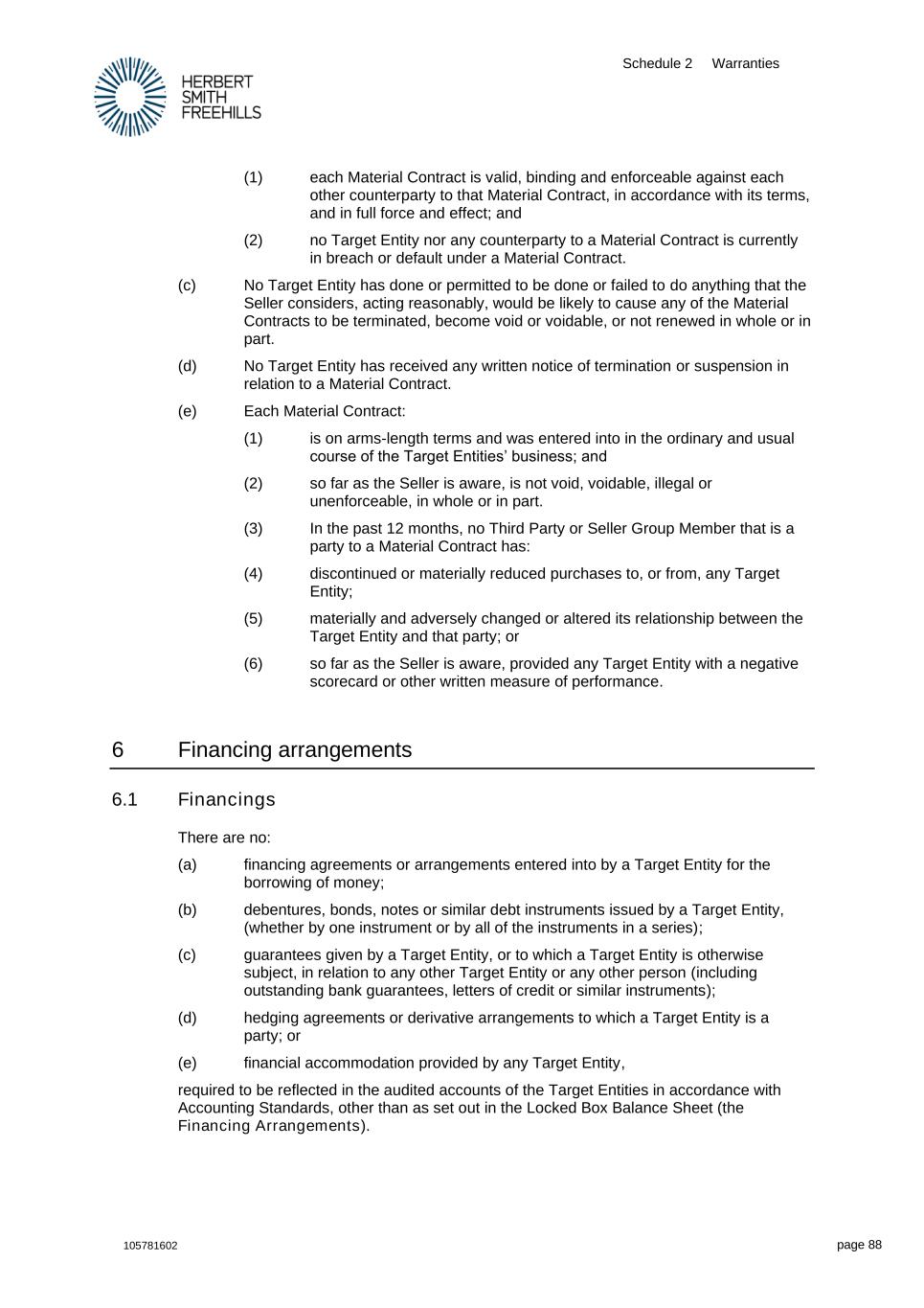 Schedule 2 Warranties 105781602 page 88 (1) each Material Contract is valid, binding and enforceable against each other counterparty to that Material Contract, in accordance with its terms, and in full force and effect; and (2) no Target Entity nor any counterparty to a Material Contract is currently in breach or default under a Material Contract. (c) No Target Entity has done or permitted to be done or failed to do anything that the Seller considers, acting reasonably, would be likely to cause any of the Material Contracts to be terminated, become void or voidable, or not renewed in whole or in part. (d) No Target Entity has received any written notice of termination or suspension in relation to a Material Contract. (e) Each Material Contract: (1) is on arms-length terms and was entered into in the ordinary and usual course of the Target Entities’ business; and (2) so far as the Seller is aware, is not void, voidable, illegal or unenforceable, in whole or in part. (3) In the past 12 months, no Third Party or Seller Group Member that is a party to a Material Contract has: (4) discontinued or materially reduced purchases to, or from, any Target Entity; (5) materially and adversely changed or altered its relationship between the Target Entity and that party; or (6) so far as the Seller is aware, provided any Target Entity with a negative scorecard or other written measure of performance. 6 Financing arrangements 6.1 Financings There are no: (a) financing agreements or arrangements entered into by a Target Entity for the borrowing of money; (b) debentures, bonds, notes or similar debt instruments issued by a Target Entity, (whether by one instrument or by all of the instruments in a series); (c) guarantees given by a Target Entity, or to which a Target Entity is otherwise subject, in relation to any other Target Entity or any other person (including outstanding bank guarantees, letters of credit or similar instruments); (d) hedging agreements or derivative arrangements to which a Target Entity is a party; or (e) financial accommodation provided by any Target Entity, required to be reflected in the audited accounts of the Target Entities in accordance with Accounting Standards, other than as set out in the Locked Box Balance Sheet (the Financing Arrangements).
