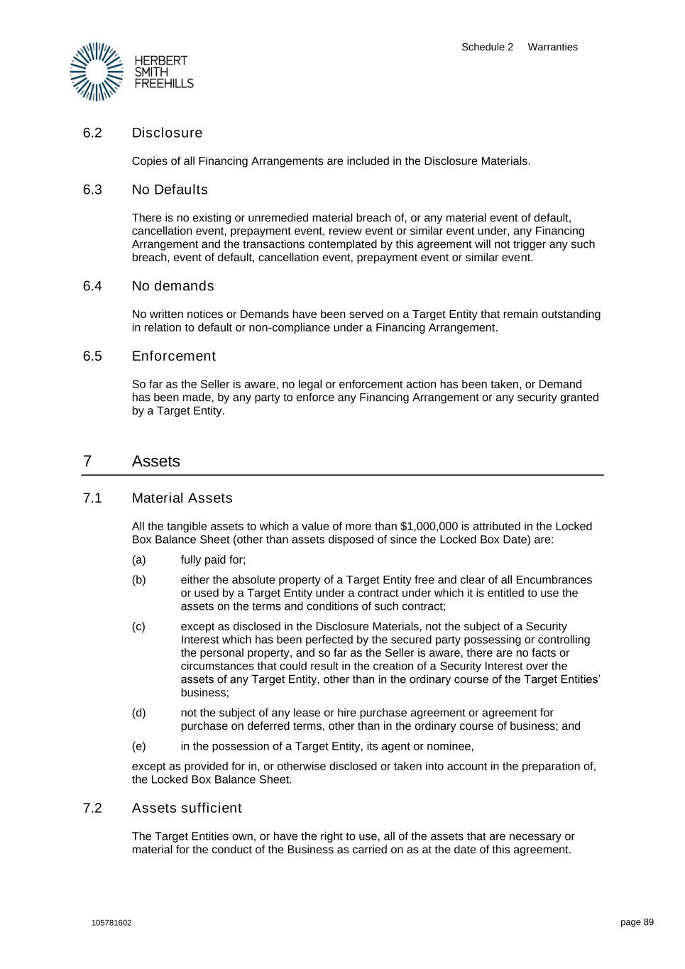 Schedule 2 Warranties 105781602 page 89 6.2 Disclosure Copies of all Financing Arrangements are included in the Disclosure Materials. 6.3 No Defaults There is no existing or unremedied material breach of, or any material event of default, cancellation event, prepayment event, review event or similar event under, any Financing Arrangement and the transactions contemplated by this agreement will not trigger any such breach, event of default, cancellation event, prepayment event or similar event. 6.4 No demands No written notices or Demands have been served on a Target Entity that remain outstanding in relation to default or non-compliance under a Financing Arrangement. 6.5 Enforcement So far as the Seller is aware, no legal or enforcement action has been taken, or Demand has been made, by any party to enforce any Financing Arrangement or any security granted by a Target Entity. 7 Assets 7.1 Material Assets All the tangible assets to which a value of more than $1,000,000 is attributed in the Locked Box Balance Sheet (other than assets disposed of since the Locked Box Date) are: (a) fully paid for; (b) either the absolute property of a Target Entity free and clear of all Encumbrances or used by a Target Entity under a contract under which it is entitled to use the assets on the terms and conditions of such contract; (c) except as disclosed in the Disclosure Materials, not the subject of a Security Interest which has been perfected by the secured party possessing or controlling the personal property, and so far as the Seller is aware, there are no facts or circumstances that could result in the creation of a Security Interest over the assets of any Target Entity, other than in the ordinary course of the Target Entities’ business; (d) not the subject of any lease or hire purchase agreement or agreement for purchase on deferred terms, other than in the ordinary course of business; and (e) in the possession of a Target Entity, its agent or nominee, except as provided for in, or otherwise disclosed or taken into account in the preparation of, the Locked Box Balance Sheet. 7.2 Assets sufficient The Target Entities own, or have the right to use, all of the assets that are necessary or material for the conduct of the Business as carried on as at the date of this agreement.