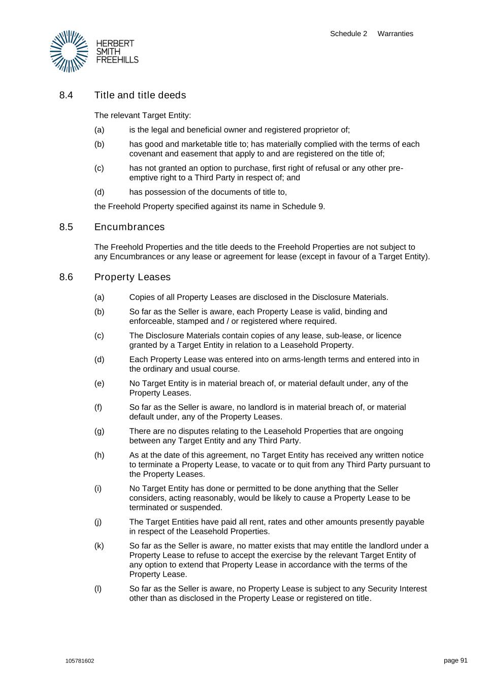 Schedule 2 Warranties 105781602 page 91 8.4 Title and title deeds The relevant Target Entity: (a) is the legal and beneficial owner and registered proprietor of; (b) has good and marketable title to; has materially complied with the terms of each covenant and easement that apply to and are registered on the title of; (c) has not granted an option to purchase, first right of refusal or any other pre- emptive right to a Third Party in respect of; and (d) has possession of the documents of title to, the Freehold Property specified against its name in Schedule 9. 8.5 Encumbrances The Freehold Properties and the title deeds to the Freehold Properties are not subject to any Encumbrances or any lease or agreement for lease (except in favour of a Target Entity). 8.6 Property Leases (a) Copies of all Property Leases are disclosed in the Disclosure Materials. (b) So far as the Seller is aware, each Property Lease is valid, binding and enforceable, stamped and / or registered where required. (c) The Disclosure Materials contain copies of any lease, sub-lease, or licence granted by a Target Entity in relation to a Leasehold Property. (d) Each Property Lease was entered into on arms-length terms and entered into in the ordinary and usual course. (e) No Target Entity is in material breach of, or material default under, any of the Property Leases. (f) So far as the Seller is aware, no landlord is in material breach of, or material default under, any of the Property Leases. (g) There are no disputes relating to the Leasehold Properties that are ongoing between any Target Entity and any Third Party. (h) As at the date of this agreement, no Target Entity has received any written notice to terminate a Property Lease, to vacate or to quit from any Third Party pursuant to the Property Leases. (i) No Target Entity has done or permitted to be done anything that the Seller considers, acting reasonably, would be likely to cause a Property Lease to be terminated or suspended. (j) The Target Entities have paid all rent, rates and other amounts presently payable in respect of the Leasehold Properties. (k) So far as the Seller is aware, no matter exists that may entitle the landlord under a Property Lease to refuse to accept the exercise by the relevant Target Entity of any option to extend that Property Lease in accordance with the terms of the Property Lease. (l) So far as the Seller is aware, no Property Lease is subject to any Security Interest other than as disclosed in the Property Lease or registered on title.