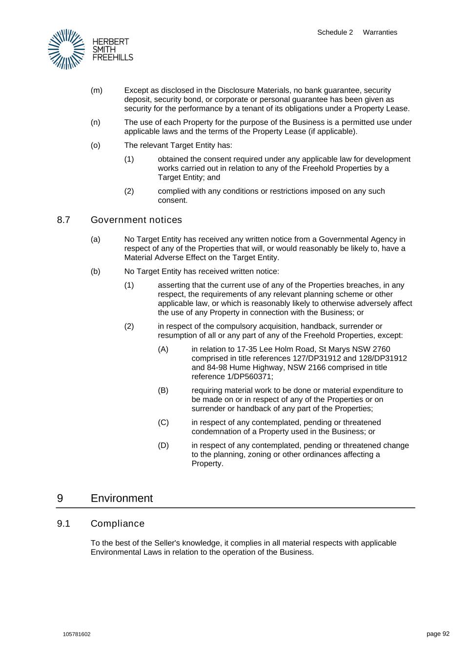 Schedule 2 Warranties 105781602 page 92 (m) Except as disclosed in the Disclosure Materials, no bank guarantee, security deposit, security bond, or corporate or personal guarantee has been given as security for the performance by a tenant of its obligations under a Property Lease. (n) The use of each Property for the purpose of the Business is a permitted use under applicable laws and the terms of the Property Lease (if applicable). (o) The relevant Target Entity has: (1) obtained the consent required under any applicable law for development works carried out in relation to any of the Freehold Properties by a Target Entity; and (2) complied with any conditions or restrictions imposed on any such consent. 8.7 Government notices (a) No Target Entity has received any written notice from a Governmental Agency in respect of any of the Properties that will, or would reasonably be likely to, have a Material Adverse Effect on the Target Entity. (b) No Target Entity has received written notice: (1) asserting that the current use of any of the Properties breaches, in any respect, the requirements of any relevant planning scheme or other applicable law, or which is reasonably likely to otherwise adversely affect the use of any Property in connection with the Business; or (2) in respect of the compulsory acquisition, handback, surrender or resumption of all or any part of any of the Freehold Properties, except: (A) in relation to 17-35 Lee Holm Road, St Marys NSW 2760 comprised in title references 127/DP31912 and 128/DP31912 and 84-98 Hume Highway, NSW 2166 comprised in title reference 1/DP560371; (B) requiring material work to be done or material expenditure to be made on or in respect of any of the Properties or on surrender or handback of any part of the Properties; (C) in respect of any contemplated, pending or threatened condemnation of a Property used in the Business; or (D) in respect of any contemplated, pending or threatened change to the planning, zoning or other ordinances affecting a Property. 9 Environment 9.1 Compliance To the best of the Seller's knowledge, it complies in all material respects with applicable Environmental Laws in relation to the operation of the Business.