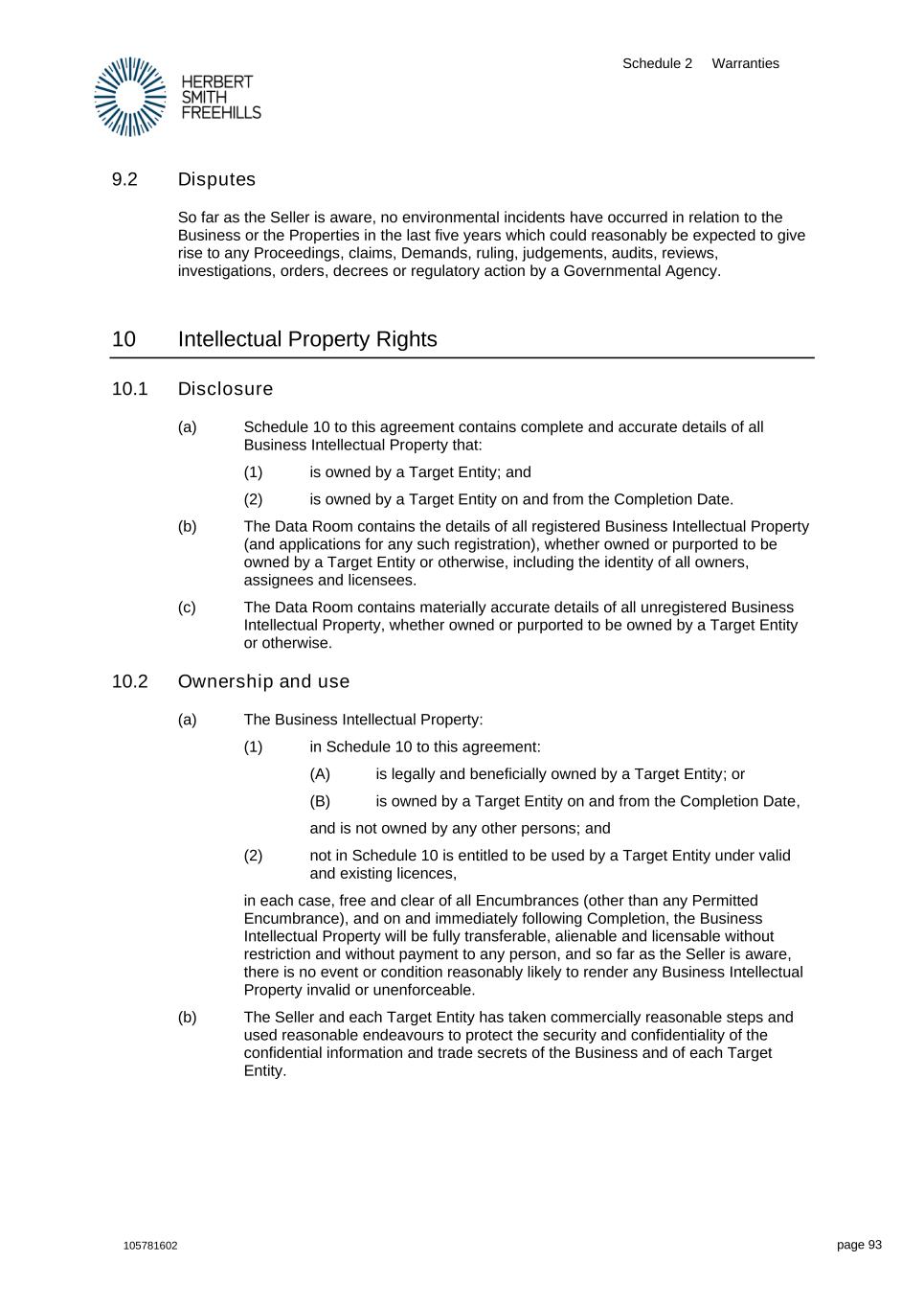 Schedule 2 Warranties 105781602 page 93 9.2 Disputes So far as the Seller is aware, no environmental incidents have occurred in relation to the Business or the Properties in the last five years which could reasonably be expected to give rise to any Proceedings, claims, Demands, ruling, judgements, audits, reviews, investigations, orders, decrees or regulatory action by a Governmental Agency. 10 Intellectual Property Rights 10.1 Disclosure (a) Schedule 10 to this agreement contains complete and accurate details of all Business Intellectual Property that: (1) is owned by a Target Entity; and (2) is owned by a Target Entity on and from the Completion Date. (b) The Data Room contains the details of all registered Business Intellectual Property (and applications for any such registration), whether owned or purported to be owned by a Target Entity or otherwise, including the identity of all owners, assignees and licensees. (c) The Data Room contains materially accurate details of all unregistered Business Intellectual Property, whether owned or purported to be owned by a Target Entity or otherwise. 10.2 Ownership and use (a) The Business Intellectual Property: (1) in Schedule 10 to this agreement: (A) is legally and beneficially owned by a Target Entity; or (B) is owned by a Target Entity on and from the Completion Date, and is not owned by any other persons; and (2) not in Schedule 10 is entitled to be used by a Target Entity under valid and existing licences, in each case, free and clear of all Encumbrances (other than any Permitted Encumbrance), and on and immediately following Completion, the Business Intellectual Property will be fully transferable, alienable and licensable without restriction and without payment to any person, and so far as the Seller is aware, there is no event or condition reasonably likely to render any Business Intellectual Property invalid or unenforceable. (b) The Seller and each Target Entity has taken commercially reasonable steps and used reasonable endeavours to protect the security and confidentiality of the confidential information and trade secrets of the Business and of each Target Entity.