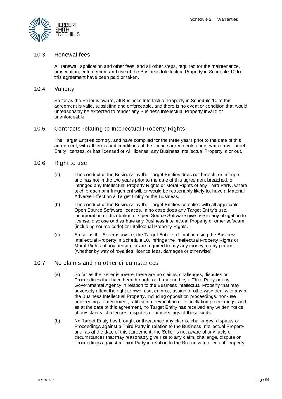 Schedule 2 Warranties 105781602 page 94 10.3 Renewal fees All renewal, application and other fees, and all other steps, required for the maintenance, prosecution, enforcement and use of the Business Intellectual Property in Schedule 10 to this agreement have been paid or taken. 10.4 Validity So far as the Seller is aware, all Business Intellectual Property in Schedule 10 to this agreement is valid, subsisting and enforceable, and there is no event or condition that would unreasonably be expected to render any Business Intellectual Property invalid or unenforceable. 10.5 Contracts relating to Intellectual Property Rights The Target Entities comply, and have complied for the three years prior to the date of this agreement, with all terms and conditions of the licence agreements under which any Target Entity licenses, or has licensed or will license, any Business Intellectual Property in or out. 10.6 Right to use (a) The conduct of the Business by the Target Entities does not breach, or infringe and has not in the two years prior to the date of this agreement breached, or infringed any Intellectual Property Rights or Moral Rights of any Third Party, where such breach or infringement will, or would be reasonably likely to, have a Material Adverse Effect on a Target Entity or the Business. (b) The conduct of the Business by the Target Entities complies with all applicable Open Source Software licences. In no case does any Target Entity's use, incorporation or distribution of Open Source Software give rise to any obligation to license, disclose or distribute any Business Intellectual Property or other software (including source code) or Intellectual Property Rights. (c) So far as the Seller is aware, the Target Entities do not, in using the Business Intellectual Property in Schedule 10, infringe the Intellectual Property Rights or Moral Rights of any person, or are required to pay any money to any person (whether by way of royalties, licence fees, damages or otherwise). 10.7 No claims and no other circumstances (a) So far as the Seller is aware, there are no claims, challenges, disputes or Proceedings that have been brought or threatened by a Third Party or any Governmental Agency in relation to the Business Intellectual Property that may adversely affect the right to own, use, enforce, assign or otherwise deal with any of the Business Intellectual Property, including opposition proceedings, non-use proceedings, amendment, ratification, revocation or cancellation proceedings, and, as at the date of this agreement, no Target Entity has received any written notice of any claims, challenges, disputes or proceedings of these kinds. (b) No Target Entity has brought or threatened any claims, challenges, disputes or Proceedings against a Third Party in relation to the Business Intellectual Property, and, as at the date of this agreement, the Seller is not aware of any facts or circumstances that may reasonably give rise to any claim, challenge, dispute or Proceedings against a Third Party in relation to the Business Intellectual Property.