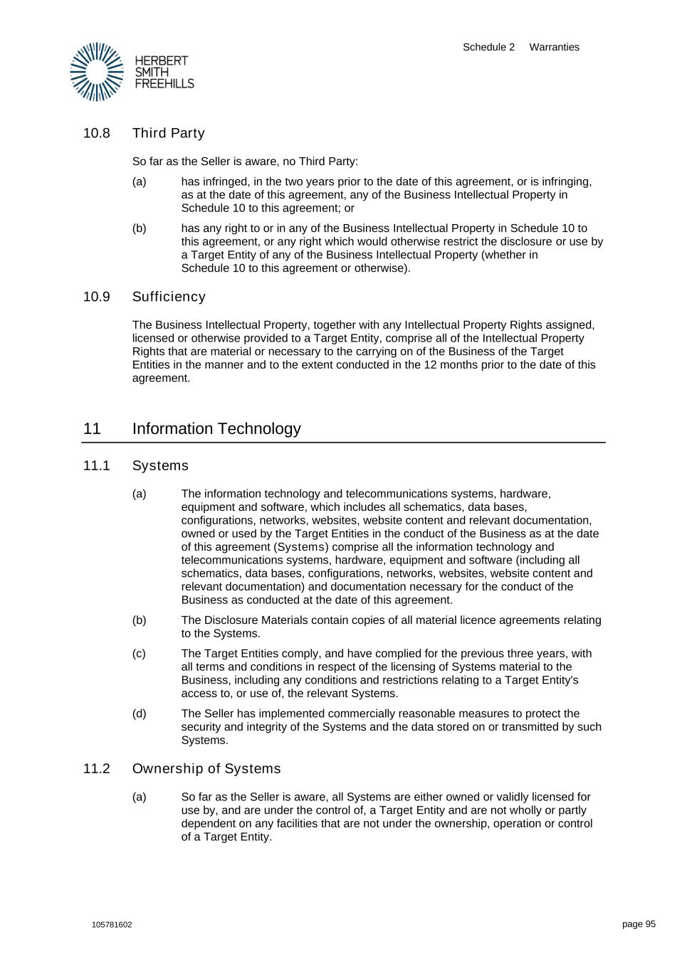 Schedule 2 Warranties 105781602 page 95 10.8 Third Party So far as the Seller is aware, no Third Party: (a) has infringed, in the two years prior to the date of this agreement, or is infringing, as at the date of this agreement, any of the Business Intellectual Property in Schedule 10 to this agreement; or (b) has any right to or in any of the Business Intellectual Property in Schedule 10 to this agreement, or any right which would otherwise restrict the disclosure or use by a Target Entity of any of the Business Intellectual Property (whether in Schedule 10 to this agreement or otherwise). 10.9 Sufficiency The Business Intellectual Property, together with any Intellectual Property Rights assigned, licensed or otherwise provided to a Target Entity, comprise all of the Intellectual Property Rights that are material or necessary to the carrying on of the Business of the Target Entities in the manner and to the extent conducted in the 12 months prior to the date of this agreement. 11 Information Technology 11.1 Systems (a) The information technology and telecommunications systems, hardware, equipment and software, which includes all schematics, data bases, configurations, networks, websites, website content and relevant documentation, owned or used by the Target Entities in the conduct of the Business as at the date of this agreement (Systems) comprise all the information technology and telecommunications systems, hardware, equipment and software (including all schematics, data bases, configurations, networks, websites, website content and relevant documentation) and documentation necessary for the conduct of the Business as conducted at the date of this agreement. (b) The Disclosure Materials contain copies of all material licence agreements relating to the Systems. (c) The Target Entities comply, and have complied for the previous three years, with all terms and conditions in respect of the licensing of Systems material to the Business, including any conditions and restrictions relating to a Target Entity's access to, or use of, the relevant Systems. (d) The Seller has implemented commercially reasonable measures to protect the security and integrity of the Systems and the data stored on or transmitted by such Systems. 11.2 Ownership of Systems (a) So far as the Seller is aware, all Systems are either owned or validly licensed for use by, and are under the control of, a Target Entity and are not wholly or partly dependent on any facilities that are not under the ownership, operation or control of a Target Entity.