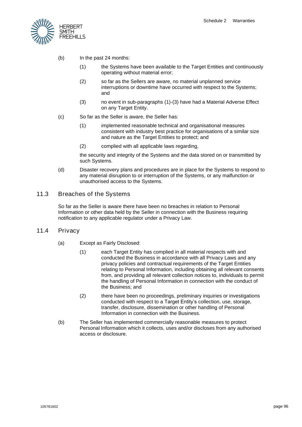 Schedule 2 Warranties 105781602 page 96 (b) In the past 24 months: (1) the Systems have been available to the Target Entities and continuously operating without material error; (2) so far as the Sellers are aware, no material unplanned service interruptions or downtime have occurred with respect to the Systems; and (3) no event in sub-paragraphs (1)-(3) have had a Material Adverse Effect on any Target Entity. (c) So far as the Seller is aware, the Seller has: (1) implemented reasonable technical and organisational measures consistent with industry best practice for organisations of a similar size and nature as the Target Entities to protect; and (2) complied with all applicable laws regarding, the security and integrity of the Systems and the data stored on or transmitted by such Systems. (d) Disaster recovery plans and procedures are in place for the Systems to respond to any material disruption to or interruption of the Systems, or any malfunction or unauthorised access to the Systems. 11.3 Breaches of the Systems So far as the Seller is aware there have been no breaches in relation to Personal Information or other data held by the Seller in connection with the Business requiring notification to any applicable regulator under a Privacy Law. 11.4 Privacy (a) Except as Fairly Disclosed: (1) each Target Entity has complied in all material respects with and conducted the Business in accordance with all Privacy Laws and any privacy policies and contractual requirements of the Target Entities relating to Personal Information, including obtaining all relevant consents from, and providing all relevant collection notices to, individuals to permit the handling of Personal Information in connection with the conduct of the Business; and (2) there have been no proceedings, preliminary inquiries or investigations conducted with respect to a Target Entity’s collection, use, storage, transfer, disclosure, dissemination or other handling of Personal Information in connection with the Business. (b) The Seller has implemented commercially reasonable measures to protect Personal Information which it collects, uses and/or discloses from any authorised access or disclosure.