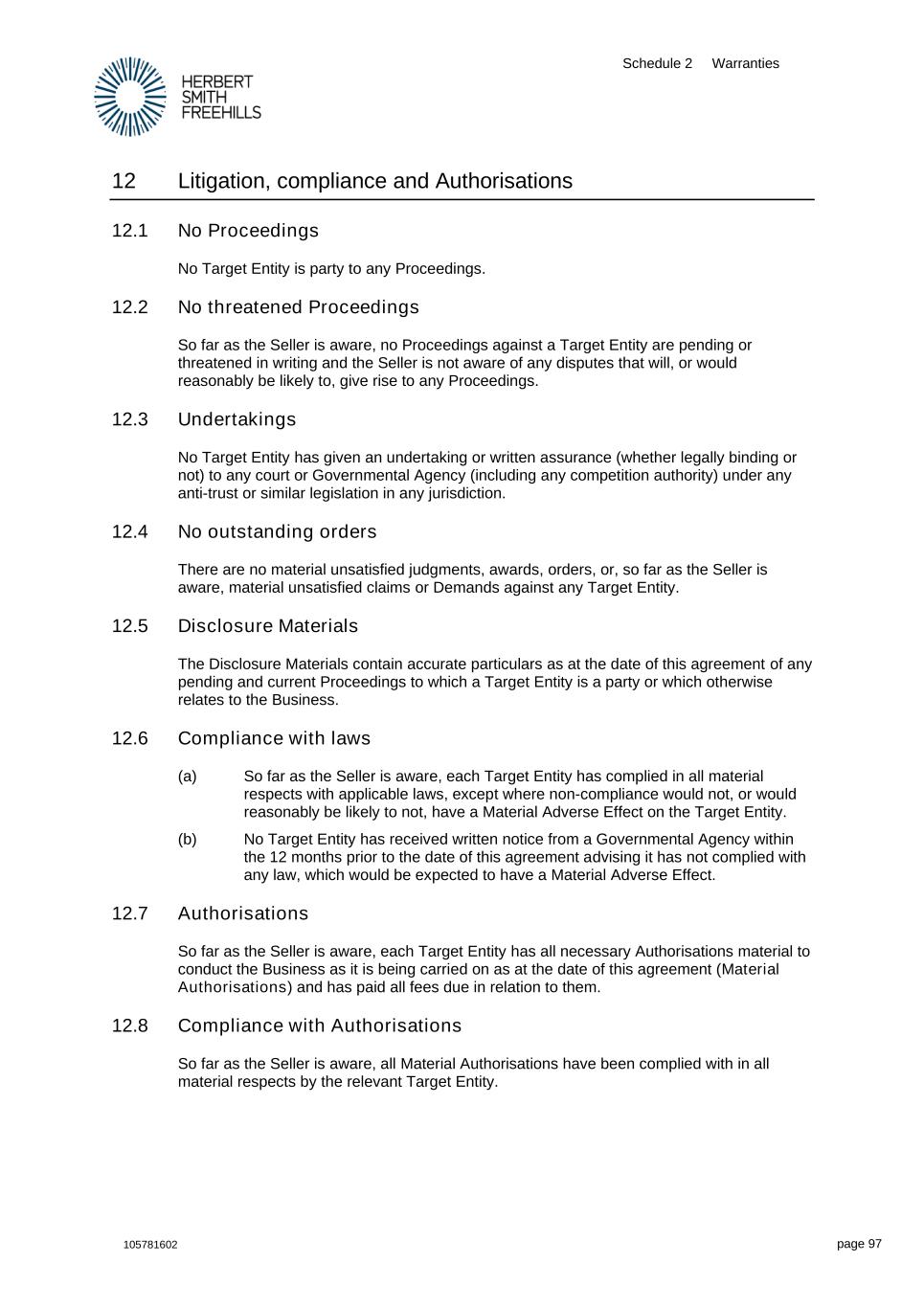 Schedule 2 Warranties 105781602 page 97 12 Litigation, compliance and Authorisations 12.1 No Proceedings No Target Entity is party to any Proceedings. 12.2 No threatened Proceedings So far as the Seller is aware, no Proceedings against a Target Entity are pending or threatened in writing and the Seller is not aware of any disputes that will, or would reasonably be likely to, give rise to any Proceedings. 12.3 Undertakings No Target Entity has given an undertaking or written assurance (whether legally binding or not) to any court or Governmental Agency (including any competition authority) under any anti-trust or similar legislation in any jurisdiction. 12.4 No outstanding orders There are no material unsatisfied judgments, awards, orders, or, so far as the Seller is aware, material unsatisfied claims or Demands against any Target Entity. 12.5 Disclosure Materials The Disclosure Materials contain accurate particulars as at the date of this agreement of any pending and current Proceedings to which a Target Entity is a party or which otherwise relates to the Business. 12.6 Compliance with laws (a) So far as the Seller is aware, each Target Entity has complied in all material respects with applicable laws, except where non-compliance would not, or would reasonably be likely to not, have a Material Adverse Effect on the Target Entity. (b) No Target Entity has received written notice from a Governmental Agency within the 12 months prior to the date of this agreement advising it has not complied with any law, which would be expected to have a Material Adverse Effect. 12.7 Authorisations So far as the Seller is aware, each Target Entity has all necessary Authorisations material to conduct the Business as it is being carried on as at the date of this agreement (Material Authorisations) and has paid all fees due in relation to them. 12.8 Compliance with Authorisations So far as the Seller is aware, all Material Authorisations have been complied with in all material respects by the relevant Target Entity.