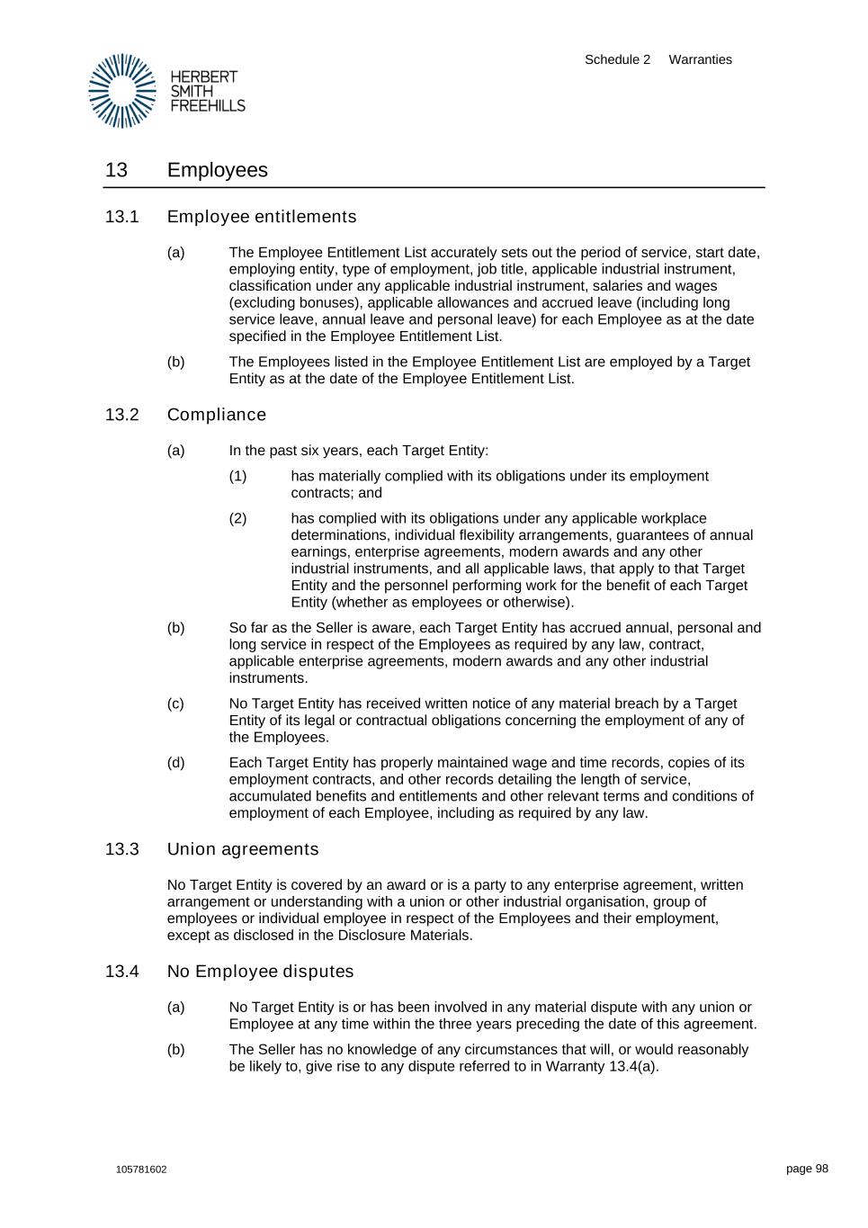 Schedule 2 Warranties 105781602 page 98 13 Employees 13.1 Employee entitlements (a) The Employee Entitlement List accurately sets out the period of service, start date, employing entity, type of employment, job title, applicable industrial instrument, classification under any applicable industrial instrument, salaries and wages (excluding bonuses), applicable allowances and accrued leave (including long service leave, annual leave and personal leave) for each Employee as at the date specified in the Employee Entitlement List. (b) The Employees listed in the Employee Entitlement List are employed by a Target Entity as at the date of the Employee Entitlement List. 13.2 Compliance (a) In the past six years, each Target Entity: (1) has materially complied with its obligations under its employment contracts; and (2) has complied with its obligations under any applicable workplace determinations, individual flexibility arrangements, guarantees of annual earnings, enterprise agreements, modern awards and any other industrial instruments, and all applicable laws, that apply to that Target Entity and the personnel performing work for the benefit of each Target Entity (whether as employees or otherwise). (b) So far as the Seller is aware, each Target Entity has accrued annual, personal and long service in respect of the Employees as required by any law, contract, applicable enterprise agreements, modern awards and any other industrial instruments. (c) No Target Entity has received written notice of any material breach by a Target Entity of its legal or contractual obligations concerning the employment of any of the Employees. (d) Each Target Entity has properly maintained wage and time records, copies of its employment contracts, and other records detailing the length of service, accumulated benefits and entitlements and other relevant terms and conditions of employment of each Employee, including as required by any law. 13.3 Union agreements No Target Entity is covered by an award or is a party to any enterprise agreement, written arrangement or understanding with a union or other industrial organisation, group of employees or individual employee in respect of the Employees and their employment, except as disclosed in the Disclosure Materials. 13.4 No Employee disputes (a) No Target Entity is or has been involved in any material dispute with any union or Employee at any time within the three years preceding the date of this agreement. (b) The Seller has no knowledge of any circumstances that will, or would reasonably be likely to, give rise to any dispute referred to in Warranty 13.4(a).