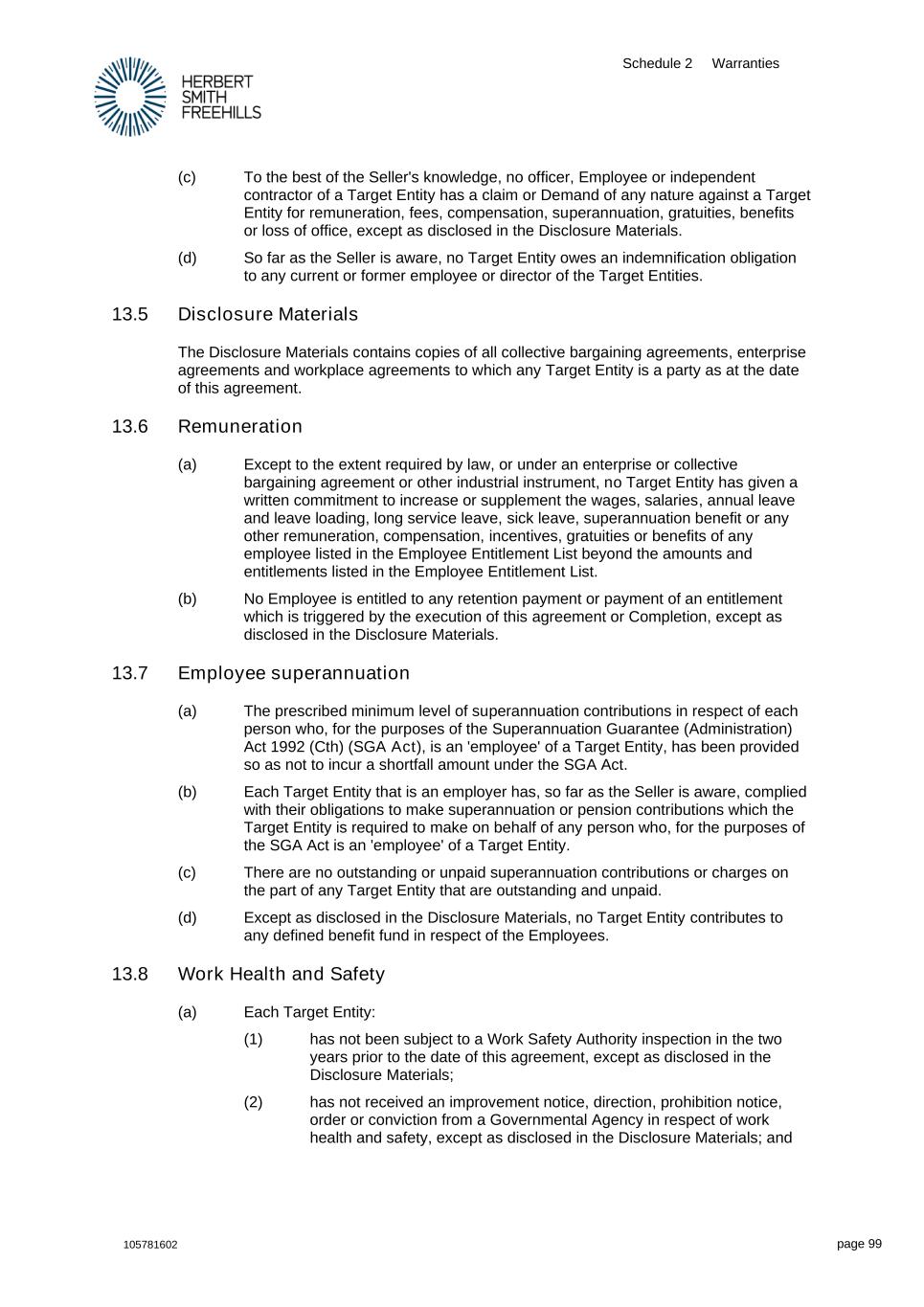 Schedule 2 Warranties 105781602 page 99 (c) To the best of the Seller's knowledge, no officer, Employee or independent contractor of a Target Entity has a claim or Demand of any nature against a Target Entity for remuneration, fees, compensation, superannuation, gratuities, benefits or loss of office, except as disclosed in the Disclosure Materials. (d) So far as the Seller is aware, no Target Entity owes an indemnification obligation to any current or former employee or director of the Target Entities. 13.5 Disclosure Materials The Disclosure Materials contains copies of all collective bargaining agreements, enterprise agreements and workplace agreements to which any Target Entity is a party as at the date of this agreement. 13.6 Remuneration (a) Except to the extent required by law, or under an enterprise or collective bargaining agreement or other industrial instrument, no Target Entity has given a written commitment to increase or supplement the wages, salaries, annual leave and leave loading, long service leave, sick leave, superannuation benefit or any other remuneration, compensation, incentives, gratuities or benefits of any employee listed in the Employee Entitlement List beyond the amounts and entitlements listed in the Employee Entitlement List. (b) No Employee is entitled to any retention payment or payment of an entitlement which is triggered by the execution of this agreement or Completion, except as disclosed in the Disclosure Materials. 13.7 Employee superannuation (a) The prescribed minimum level of superannuation contributions in respect of each person who, for the purposes of the Superannuation Guarantee (Administration) Act 1992 (Cth) (SGA Act), is an 'employee' of a Target Entity, has been provided so as not to incur a shortfall amount under the SGA Act. (b) Each Target Entity that is an employer has, so far as the Seller is aware, complied with their obligations to make superannuation or pension contributions which the Target Entity is required to make on behalf of any person who, for the purposes of the SGA Act is an 'employee' of a Target Entity. (c) There are no outstanding or unpaid superannuation contributions or charges on the part of any Target Entity that are outstanding and unpaid. (d) Except as disclosed in the Disclosure Materials, no Target Entity contributes to any defined benefit fund in respect of the Employees. 13.8 Work Health and Safety (a) Each Target Entity: (1) has not been subject to a Work Safety Authority inspection in the two years prior to the date of this agreement, except as disclosed in the Disclosure Materials; (2) has not received an improvement notice, direction, prohibition notice, order or conviction from a Governmental Agency in respect of work health and safety, except as disclosed in the Disclosure Materials; and