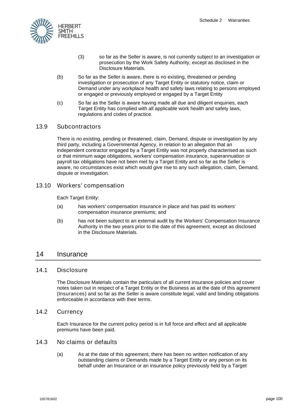 Schedule 2 Warranties 105781602 page 100 (3) so far as the Seller is aware, is not currently subject to an investigation or prosecution by the Work Safety Authority, except as disclosed in the Disclosure Materials. (b) So far as the Seller is aware, there is no existing, threatened or pending investigation or prosecution of any Target Entity or statutory notice, claim or Demand under any workplace health and safety laws relating to persons employed or engaged or previously employed or engaged by a Target Entity (c) So far as the Seller is aware having made all due and diligent enquiries, each Target Entity has complied with all applicable work health and safety laws, regulations and codes of practice. 13.9 Subcontractors There is no existing, pending or threatened, claim, Demand, dispute or investigation by any third party, including a Governmental Agency, in relation to an allegation that an independent contractor engaged by a Target Entity was not properly characterised as such or that minimum wage obligations, workers' compensation insurance, superannuation or payroll tax obligations have not been met by a Target Entity and so far as the Seller is aware, no circumstances exist which would give rise to any such allegation, claim, Demand, dispute or investigation. 13.10 Workers' compensation Each Target Entity: (a) has workers' compensation insurance in place and has paid its workers' compensation insurance premiums; and (b) has not been subject to an external audit by the Workers' Compensation Insurance Authority in the two years prior to the date of this agreement, except as disclosed in the Disclosure Materials. 14 Insurance 14.1 Disclosure The Disclosure Materials contain the particulars of all current insurance policies and cover notes taken out in respect of a Target Entity or the Business as at the date of this agreement (Insurances) and so far as the Seller is aware constitute legal, valid and binding obligations enforceable in accordance with their terms. 14.2 Currency Each Insurance for the current policy period is in full force and effect and all applicable premiums have been paid. 14.3 No claims or defaults (a) As at the date of this agreement, there has been no written notification of any outstanding claims or Demands made by a Target Entity or any person on its behalf under an Insurance or an insurance policy previously held by a Target