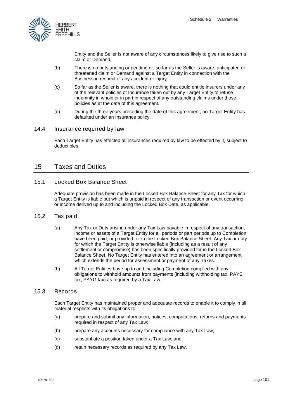 Schedule 2 Warranties 105781602 page 101 Entity and the Seller is not aware of any circumstances likely to give rise to such a claim or Demand. (b) There is no outstanding or pending or, so far as the Seller is aware, anticipated or threatened claim or Demand against a Target Entity in connection with the Business in respect of any accident or injury. (c) So far as the Seller is aware, there is nothing that could entitle insurers under any of the relevant policies of Insurance taken out by any Target Entity to refuse indemnity in whole or in part in respect of any outstanding claims under those policies as at the date of this agreement. (d) During the three years preceding the date of this agreement, no Target Entity has defaulted under an Insurance policy. 14.4 Insurance required by law Each Target Entity has effected all insurances required by law to be effected by it, subject to deductibles. 15 Taxes and Duties 15.1 Locked Box Balance Sheet Adequate provision has been made in the Locked Box Balance Sheet for any Tax for which a Target Entity is liable but which is unpaid in respect of any transaction or event occurring or income derived up to and including the Locked Box Date, as applicable. 15.2 Tax paid (a) Any Tax or Duty arising under any Tax Law payable in respect of any transaction, income or assets of a Target Entity for all periods or part periods up to Completion have been paid, or provided for in the Locked Box Balance Sheet. Any Tax or duty for which the Target Entity is otherwise liable (including as a result of any settlement or compromise) has been specifically provided for in the Locked Box Balance Sheet. No Target Entity has entered into an agreement or arrangement which extends the period for assessment or payment of any Taxes. (b) All Target Entities have up to and including Completion complied with any obligations to withhold amounts from payments (including withholding tax, PAYE tax, PAYG tax) as required by a Tax Law. 15.3 Records Each Target Entity has maintained proper and adequate records to enable it to comply in all material respects with its obligations to: (a) prepare and submit any information, notices, computations, returns and payments required in respect of any Tax Law; (b) prepare any accounts necessary for compliance with any Tax Law; (c) substantiate a position taken under a Tax Law; and (d) retain necessary records as required by any Tax Law,