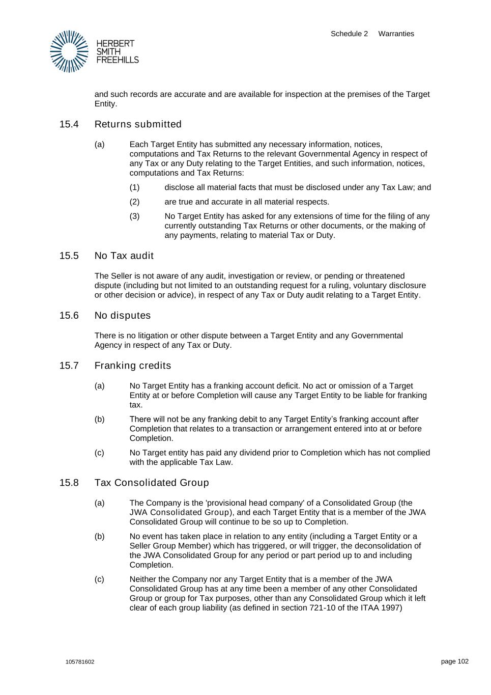 Schedule 2 Warranties 105781602 page 102 and such records are accurate and are available for inspection at the premises of the Target Entity. 15.4 Returns submitted (a) Each Target Entity has submitted any necessary information, notices, computations and Tax Returns to the relevant Governmental Agency in respect of any Tax or any Duty relating to the Target Entities, and such information, notices, computations and Tax Returns: (1) disclose all material facts that must be disclosed under any Tax Law; and (2) are true and accurate in all material respects. (3) No Target Entity has asked for any extensions of time for the filing of any currently outstanding Tax Returns or other documents, or the making of any payments, relating to material Tax or Duty. 15.5 No Tax audit The Seller is not aware of any audit, investigation or review, or pending or threatened dispute (including but not limited to an outstanding request for a ruling, voluntary disclosure or other decision or advice), in respect of any Tax or Duty audit relating to a Target Entity. 15.6 No disputes There is no litigation or other dispute between a Target Entity and any Governmental Agency in respect of any Tax or Duty. 15.7 Franking credits (a) No Target Entity has a franking account deficit. No act or omission of a Target Entity at or before Completion will cause any Target Entity to be liable for franking tax. (b) There will not be any franking debit to any Target Entity’s franking account after Completion that relates to a transaction or arrangement entered into at or before Completion. (c) No Target entity has paid any dividend prior to Completion which has not complied with the applicable Tax Law. 15.8 Tax Consolidated Group (a) The Company is the 'provisional head company' of a Consolidated Group (the JWA Consolidated Group), and each Target Entity that is a member of the JWA Consolidated Group will continue to be so up to Completion. (b) No event has taken place in relation to any entity (including a Target Entity or a Seller Group Member) which has triggered, or will trigger, the deconsolidation of the JWA Consolidated Group for any period or part period up to and including Completion. (c) Neither the Company nor any Target Entity that is a member of the JWA Consolidated Group has at any time been a member of any other Consolidated Group or group for Tax purposes, other than any Consolidated Group which it left clear of each group liability (as defined in section 721-10 of the ITAA 1997)