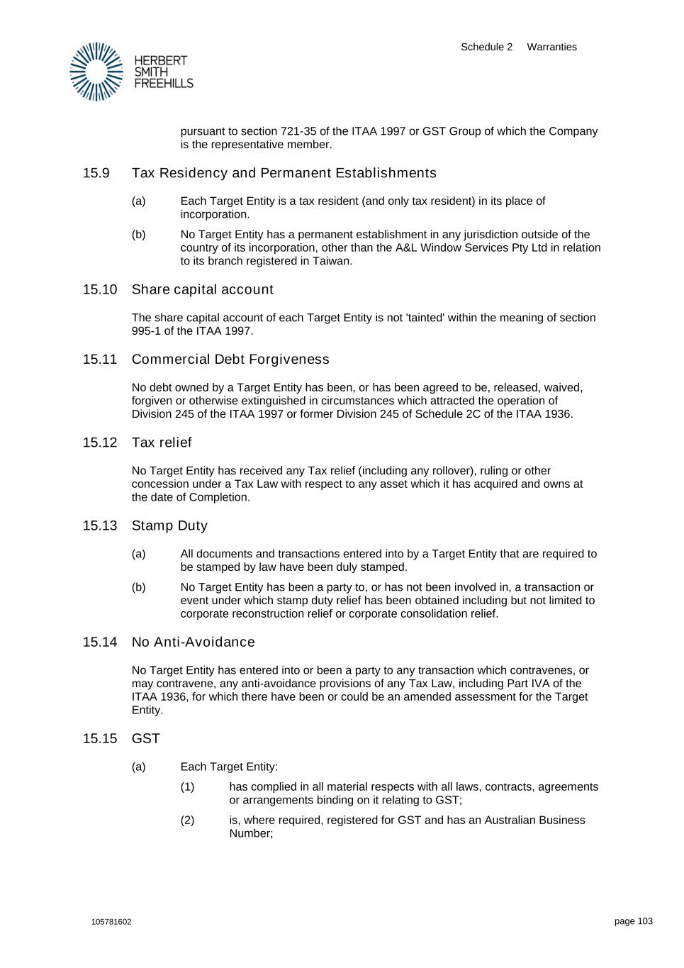 Schedule 2 Warranties 105781602 page 103 pursuant to section 721-35 of the ITAA 1997 or GST Group of which the Company is the representative member. 15.9 Tax Residency and Permanent Establishments (a) Each Target Entity is a tax resident (and only tax resident) in its place of incorporation. (b) No Target Entity has a permanent establishment in any jurisdiction outside of the country of its incorporation, other than the A&L Window Services Pty Ltd in relation to its branch registered in Taiwan. 15.10 Share capital account The share capital account of each Target Entity is not 'tainted' within the meaning of section 995-1 of the ITAA 1997. 15.11 Commercial Debt Forgiveness No debt owned by a Target Entity has been, or has been agreed to be, released, waived, forgiven or otherwise extinguished in circumstances which attracted the operation of Division 245 of the ITAA 1997 or former Division 245 of Schedule 2C of the ITAA 1936. 15.12 Tax relief No Target Entity has received any Tax relief (including any rollover), ruling or other concession under a Tax Law with respect to any asset which it has acquired and owns at the date of Completion. 15.13 Stamp Duty (a) All documents and transactions entered into by a Target Entity that are required to be stamped by law have been duly stamped. (b) No Target Entity has been a party to, or has not been involved in, a transaction or event under which stamp duty relief has been obtained including but not limited to corporate reconstruction relief or corporate consolidation relief. 15.14 No Anti-Avoidance No Target Entity has entered into or been a party to any transaction which contravenes, or may contravene, any anti-avoidance provisions of any Tax Law, including Part IVA of the ITAA 1936, for which there have been or could be an amended assessment for the Target Entity. 15.15 GST (a) Each Target Entity: (1) has complied in all material respects with all laws, contracts, agreements or arrangements binding on it relating to GST; (2) is, where required, registered for GST and has an Australian Business Number;
