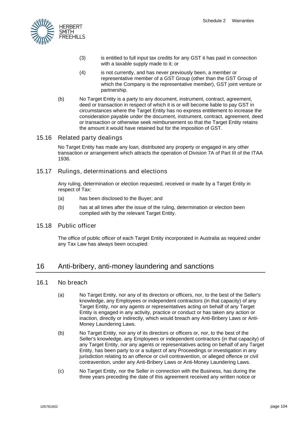 Schedule 2 Warranties 105781602 page 104 (3) is entitled to full input tax credits for any GST it has paid in connection with a taxable supply made to it; or (4) is not currently, and has never previously been, a member or representative member of a GST Group (other than the GST Group of which the Company is the representative member), GST joint venture or partnership. (b) No Target Entity is a party to any document, instrument, contract, agreement, deed or transaction in respect of which it is or will become liable to pay GST in circumstances where the Target Entity has no express entitlement to increase the consideration payable under the document, instrument, contract, agreement, deed or transaction or otherwise seek reimbursement so that the Target Entity retains the amount it would have retained but for the imposition of GST. 15.16 Related party dealings No Target Entity has made any loan, distributed any property or engaged in any other transaction or arrangement which attracts the operation of Division 7A of Part III of the ITAA 1936. 15.17 Rulings, determinations and elections Any ruling, determination or election requested, received or made by a Target Entity in respect of Tax: (a) has been disclosed to the Buyer; and (b) has at all times after the issue of the ruling, determination or election been complied with by the relevant Target Entity. 15.18 Public officer The office of public officer of each Target Entity incorporated in Australia as required under any Tax Law has always been occupied. 16 Anti-bribery, anti-money laundering and sanctions 16.1 No breach (a) No Target Entity, nor any of its directors or officers, nor, to the best of the Seller's knowledge, any Employees or independent contractors (in that capacity) of any Target Entity, nor any agents or representatives acting on behalf of any Target Entity is engaged in any activity, practice or conduct or has taken any action or inaction, directly or indirectly, which would breach any Anti-Bribery Laws or Anti- Money Laundering Laws. (b) No Target Entity, nor any of its directors or officers or, nor, to the best of the Seller's knowledge, any Employees or independent contractors (in that capacity) of any Target Entity, nor any agents or representatives acting on behalf of any Target Entity, has been party to or a subject of any Proceedings or investigation in any jurisdiction relating to an offence or civil contravention, or alleged offence or civil contravention, under any Anti-Bribery Laws or Anti-Money Laundering Laws. (c) No Target Entity, nor the Seller in connection with the Business, has during the three years preceding the date of this agreement received any written notice or