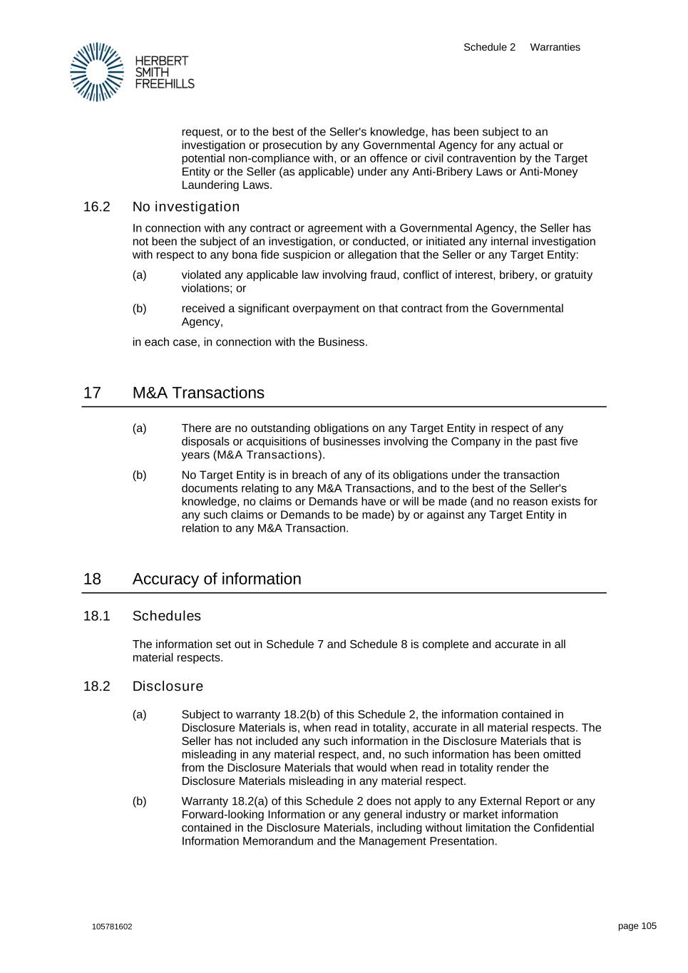 Schedule 2 Warranties 105781602 page 105 request, or to the best of the Seller's knowledge, has been subject to an investigation or prosecution by any Governmental Agency for any actual or potential non-compliance with, or an offence or civil contravention by the Target Entity or the Seller (as applicable) under any Anti-Bribery Laws or Anti-Money Laundering Laws. 16.2 No investigation In connection with any contract or agreement with a Governmental Agency, the Seller has not been the subject of an investigation, or conducted, or initiated any internal investigation with respect to any bona fide suspicion or allegation that the Seller or any Target Entity: (a) violated any applicable law involving fraud, conflict of interest, bribery, or gratuity violations; or (b) received a significant overpayment on that contract from the Governmental Agency, in each case, in connection with the Business. 17 M&A Transactions (a) There are no outstanding obligations on any Target Entity in respect of any disposals or acquisitions of businesses involving the Company in the past five years (M&A Transactions). (b) No Target Entity is in breach of any of its obligations under the transaction documents relating to any M&A Transactions, and to the best of the Seller's knowledge, no claims or Demands have or will be made (and no reason exists for any such claims or Demands to be made) by or against any Target Entity in relation to any M&A Transaction. 18 Accuracy of information 18.1 Schedules The information set out in Schedule 7 and Schedule 8 is complete and accurate in all material respects. 18.2 Disclosure (a) Subject to warranty 18.2(b) of this Schedule 2, the information contained in Disclosure Materials is, when read in totality, accurate in all material respects. The Seller has not included any such information in the Disclosure Materials that is misleading in any material respect, and, no such information has been omitted from the Disclosure Materials that would when read in totality render the Disclosure Materials misleading in any material respect. (b) Warranty 18.2(a) of this Schedule 2 does not apply to any External Report or any Forward-looking Information or any general industry or market information contained in the Disclosure Materials, including without limitation the Confidential Information Memorandum and the Management Presentation.