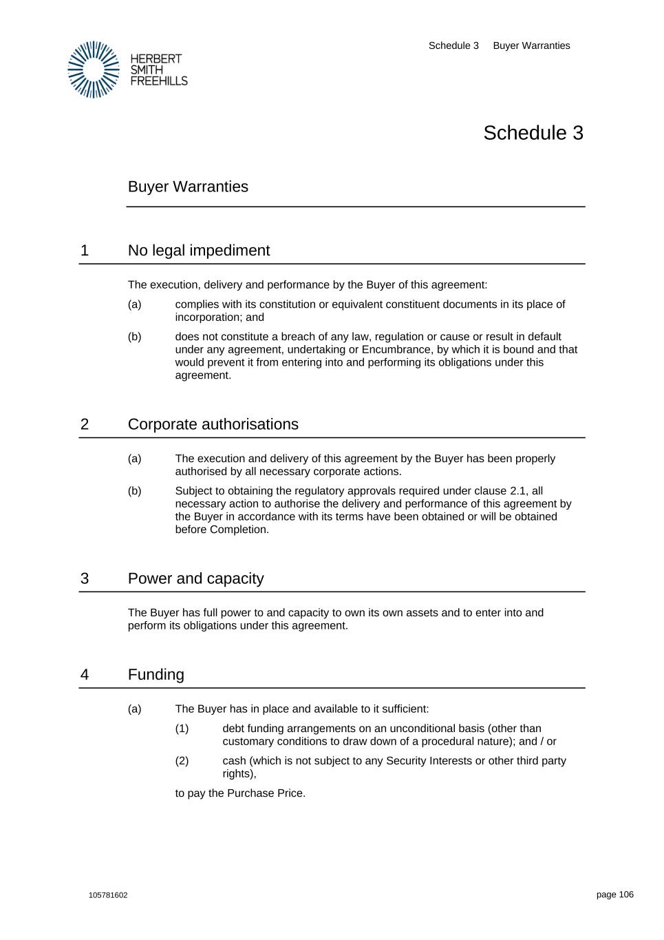 Schedule 3 Buyer Warranties 105781602 page 106 Schedule 3 Buyer Warranties 1 No legal impediment The execution, delivery and performance by the Buyer of this agreement: (a) complies with its constitution or equivalent constituent documents in its place of incorporation; and (b) does not constitute a breach of any law, regulation or cause or result in default under any agreement, undertaking or Encumbrance, by which it is bound and that would prevent it from entering into and performing its obligations under this agreement. 2 Corporate authorisations (a) The execution and delivery of this agreement by the Buyer has been properly authorised by all necessary corporate actions. (b) Subject to obtaining the regulatory approvals required under clause 2.1, all necessary action to authorise the delivery and performance of this agreement by the Buyer in accordance with its terms have been obtained or will be obtained before Completion. 3 Power and capacity The Buyer has full power to and capacity to own its own assets and to enter into and perform its obligations under this agreement. 4 Funding (a) The Buyer has in place and available to it sufficient: (1) debt funding arrangements on an unconditional basis (other than customary conditions to draw down of a procedural nature); and / or (2) cash (which is not subject to any Security Interests or other third party rights), to pay the Purchase Price.