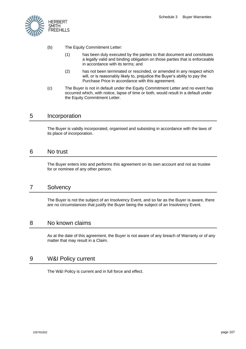 Schedule 3 Buyer Warranties 105781602 page 107 (b) The Equity Commitment Letter: (1) has been duly executed by the parties to that document and constitutes a legally valid and binding obligation on those parties that is enforceable in accordance with its terms; and (2) has not been terminated or rescinded, or amended in any respect which will, or is reasonably likely to, prejudice the Buyer’s ability to pay the Purchase Price in accordance with this agreement. (c) The Buyer is not in default under the Equity Commitment Letter and no event has occurred which, with notice, lapse of time or both, would result in a default under the Equity Commitment Letter. 5 Incorporation The Buyer is validly incorporated, organised and subsisting in accordance with the laws of its place of incorporation. 6 No trust The Buyer enters into and performs this agreement on its own account and not as trustee for or nominee of any other person. 7 Solvency The Buyer is not the subject of an Insolvency Event, and so far as the Buyer is aware, there are no circumstances that justify the Buyer being the subject of an Insolvency Event. 8 No known claims As at the date of this agreement, the Buyer is not aware of any breach of Warranty or of any matter that may result in a Claim. 9 W&I Policy current The W&I Policy is current and in full force and effect.
