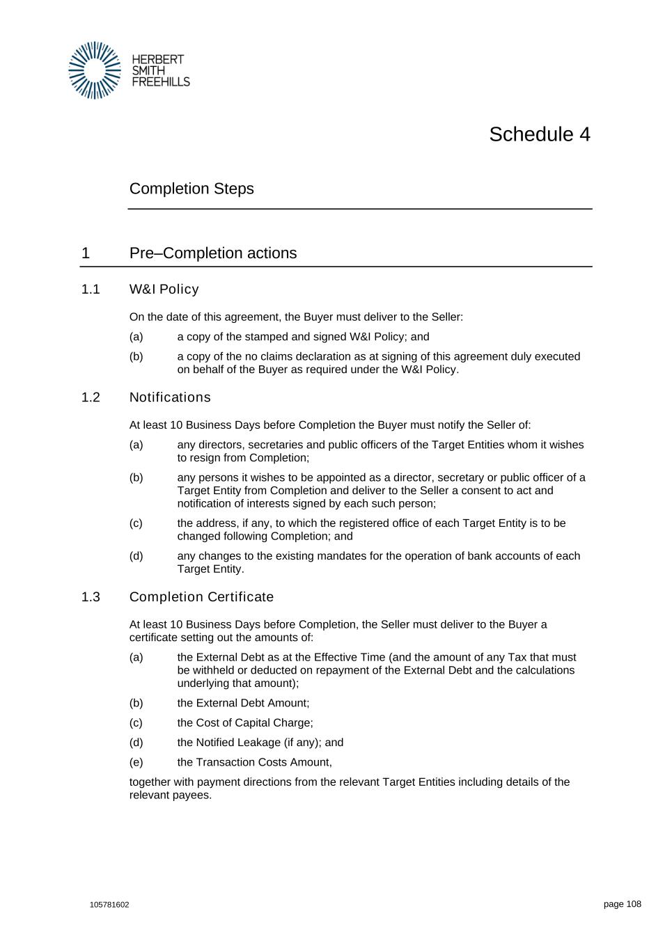 105781602 page 108 Schedule 4 Completion Steps 1 Pre–Completion actions 1.1 W&I Policy On the date of this agreement, the Buyer must deliver to the Seller: (a) a copy of the stamped and signed W&I Policy; and (b) a copy of the no claims declaration as at signing of this agreement duly executed on behalf of the Buyer as required under the W&I Policy. 1.2 Notifications At least 10 Business Days before Completion the Buyer must notify the Seller of: (a) any directors, secretaries and public officers of the Target Entities whom it wishes to resign from Completion; (b) any persons it wishes to be appointed as a director, secretary or public officer of a Target Entity from Completion and deliver to the Seller a consent to act and notification of interests signed by each such person; (c) the address, if any, to which the registered office of each Target Entity is to be changed following Completion; and (d) any changes to the existing mandates for the operation of bank accounts of each Target Entity. 1.3 Completion Certificate At least 10 Business Days before Completion, the Seller must deliver to the Buyer a certificate setting out the amounts of: (a) the External Debt as at the Effective Time (and the amount of any Tax that must be withheld or deducted on repayment of the External Debt and the calculations underlying that amount); (b) the External Debt Amount; (c) the Cost of Capital Charge; (d) the Notified Leakage (if any); and (e) the Transaction Costs Amount, together with payment directions from the relevant Target Entities including details of the relevant payees.