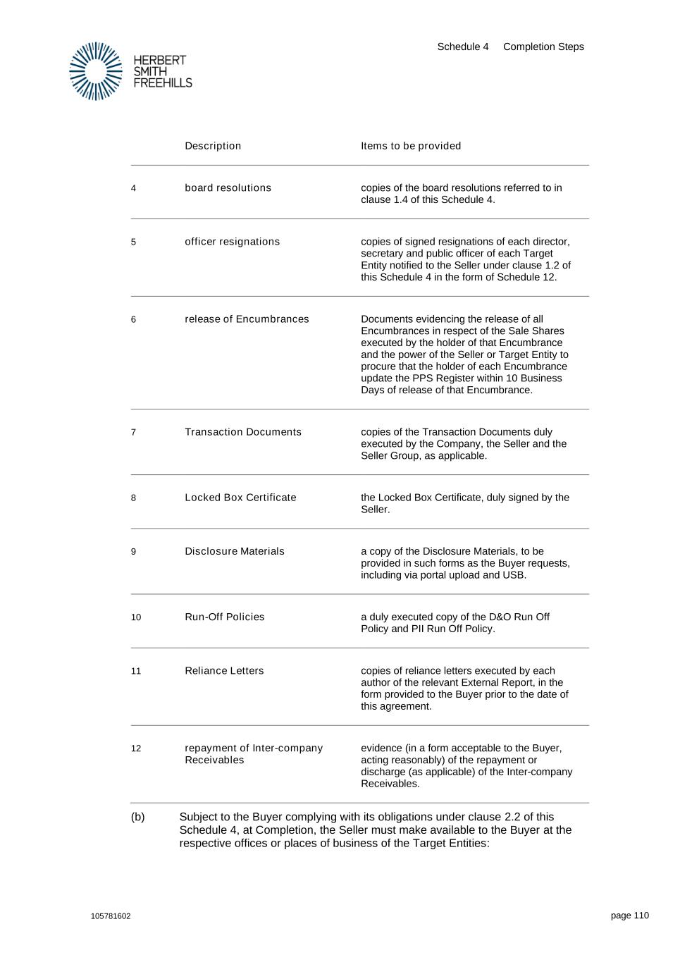 Schedule 4 Completion Steps 105781602 page 110 Description Items to be provided 4 board resolutions copies of the board resolutions referred to in clause 1.4 of this Schedule 4. 5 officer resignations copies of signed resignations of each director, secretary and public officer of each Target Entity notified to the Seller under clause 1.2 of this Schedule 4 in the form of Schedule 12. 6 release of Encumbrances Documents evidencing the release of all Encumbrances in respect of the Sale Shares executed by the holder of that Encumbrance and the power of the Seller or Target Entity to procure that the holder of each Encumbrance update the PPS Register within 10 Business Days of release of that Encumbrance. 7 Transaction Documents copies of the Transaction Documents duly executed by the Company, the Seller and the Seller Group, as applicable. 8 Locked Box Certificate the Locked Box Certificate, duly signed by the Seller. 9 Disclosure Materials a copy of the Disclosure Materials, to be provided in such forms as the Buyer requests, including via portal upload and USB. 10 Run-Off Policies a duly executed copy of the D&O Run Off Policy and PII Run Off Policy. 11 Reliance Letters copies of reliance letters executed by each author of the relevant External Report, in the form provided to the Buyer prior to the date of this agreement. 12 repayment of Inter-company Receivables evidence (in a form acceptable to the Buyer, acting reasonably) of the repayment or discharge (as applicable) of the Inter-company Receivables. (b) Subject to the Buyer complying with its obligations under clause 2.2 of this Schedule 4, at Completion, the Seller must make available to the Buyer at the respective offices or places of business of the Target Entities: