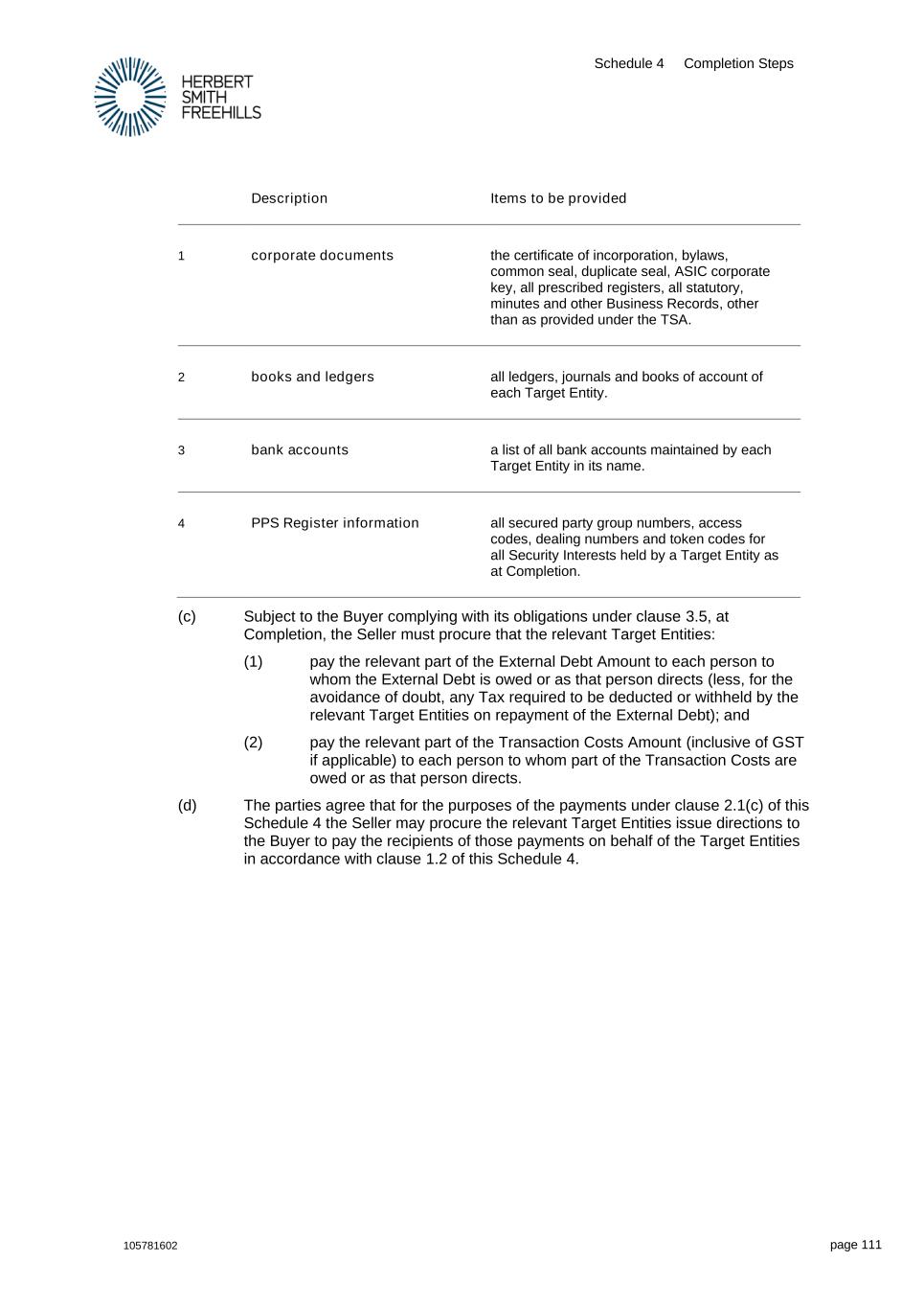 Schedule 4 Completion Steps 105781602 page 111 Description Items to be provided 1 corporate documents the certificate of incorporation, bylaws, common seal, duplicate seal, ASIC corporate key, all prescribed registers, all statutory, minutes and other Business Records, other than as provided under the TSA. 2 books and ledgers all ledgers, journals and books of account of each Target Entity. 3 bank accounts a list of all bank accounts maintained by each Target Entity in its name. 4 PPS Register information all secured party group numbers, access codes, dealing numbers and token codes for all Security Interests held by a Target Entity as at Completion. (c) Subject to the Buyer complying with its obligations under clause 3.5, at Completion, the Seller must procure that the relevant Target Entities: (1) pay the relevant part of the External Debt Amount to each person to whom the External Debt is owed or as that person directs (less, for the avoidance of doubt, any Tax required to be deducted or withheld by the relevant Target Entities on repayment of the External Debt); and (2) pay the relevant part of the Transaction Costs Amount (inclusive of GST if applicable) to each person to whom part of the Transaction Costs are owed or as that person directs. (d) The parties agree that for the purposes of the payments under clause 2.1(c) of this Schedule 4 the Seller may procure the relevant Target Entities issue directions to the Buyer to pay the recipients of those payments on behalf of the Target Entities in accordance with clause 1.2 of this Schedule 4.