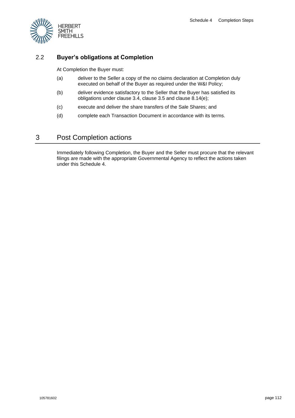 Schedule 4 Completion Steps 105781602 page 112 2.2 Buyer’s obligations at Completion At Completion the Buyer must: (a) deliver to the Seller a copy of the no claims declaration at Completion duly executed on behalf of the Buyer as required under the W&I Policy; (b) deliver evidence satisfactory to the Seller that the Buyer has satisfied its obligations under clause 3.4, clause 3.5 and clause 8.14(e); (c) execute and deliver the share transfers of the Sale Shares; and (d) complete each Transaction Document in accordance with its terms. 3 Post Completion actions Immediately following Completion, the Buyer and the Seller must procure that the relevant filings are made with the appropriate Governmental Agency to reflect the actions taken under this Schedule 4.